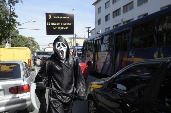 Um grupo de quatro atores fez nesta terça-feira (21), das 9h às 13h, intervenção inusitada nas esquinas das avenidas Sete de Setembro e Dona Eugênia Machado da Silva, na Vila Galvão. Motoristas, ciclistas, motociclistas e pedestres que passaram pelo local se depararam com a “morte” empunhando um cartaz onde se lia: “Você me chamou quando bebeu e sentou ao volante”.