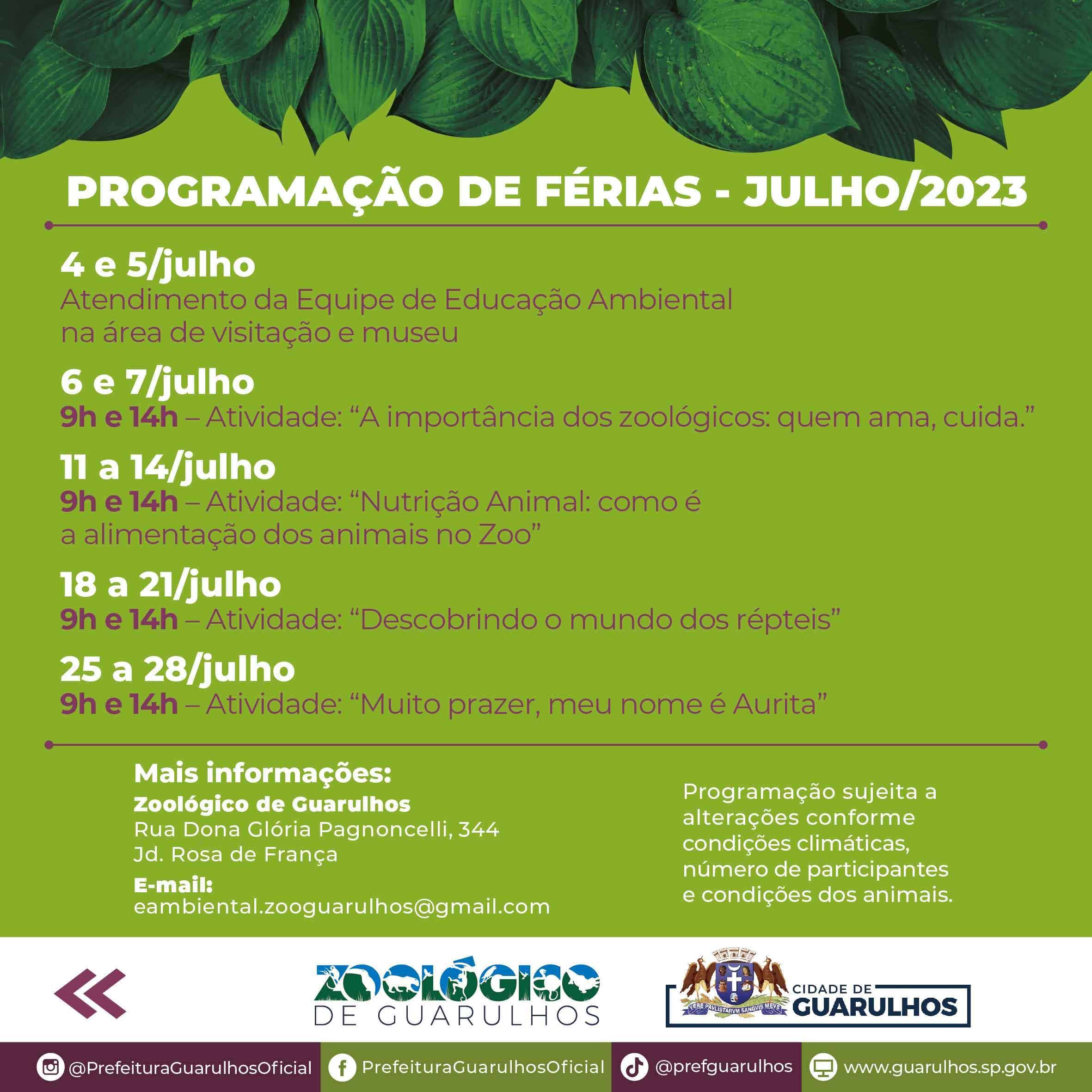 O Zoológico de Guarulhos fica na rua Dona Glória Pagnoncelli, 344, é gratuito e está aberto de terça-feira feira a domingo, das 9h às 17h (entrada até as 16h30).