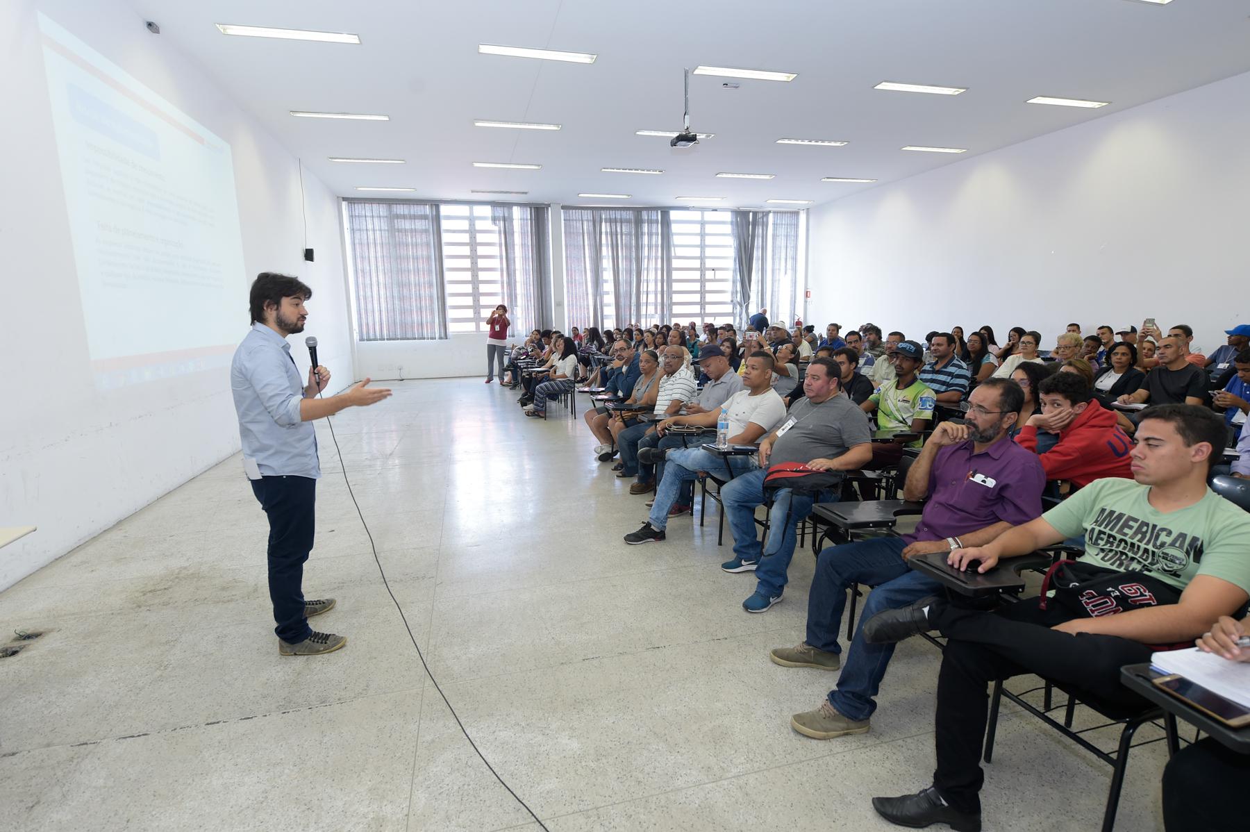 O Adamastor Centro recebeu na última terça-feira (02) cerca de 250 alunos dos cursos do Centro de Treinamento de Mão de Obra (CTMO) para assistirem, em dois turnos, à palestra sobre o MEI - Micro Empreendedor Individual, ministrada por Esther Regina Novalo e Luís Claudio Groppa, consultores do SEBRAE.