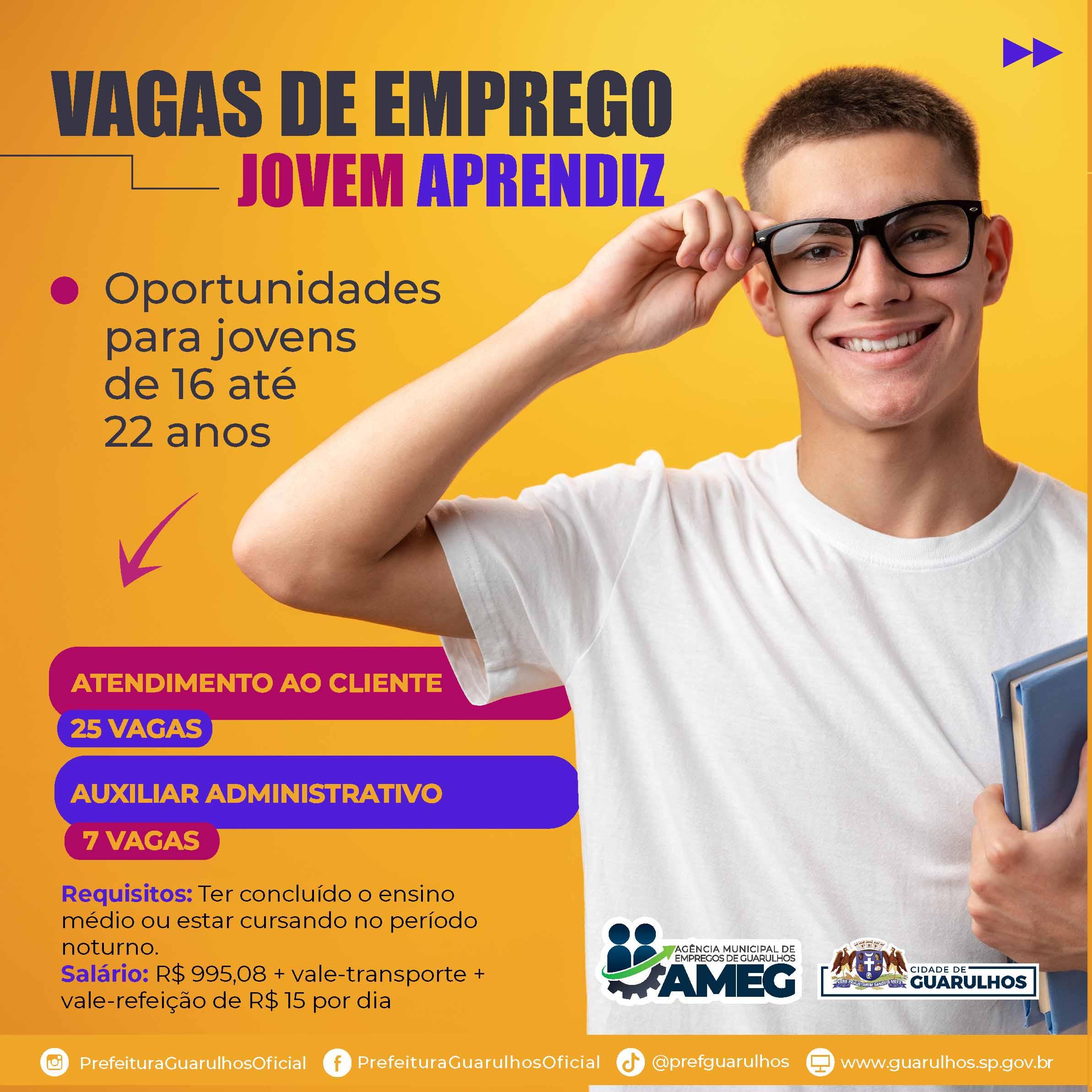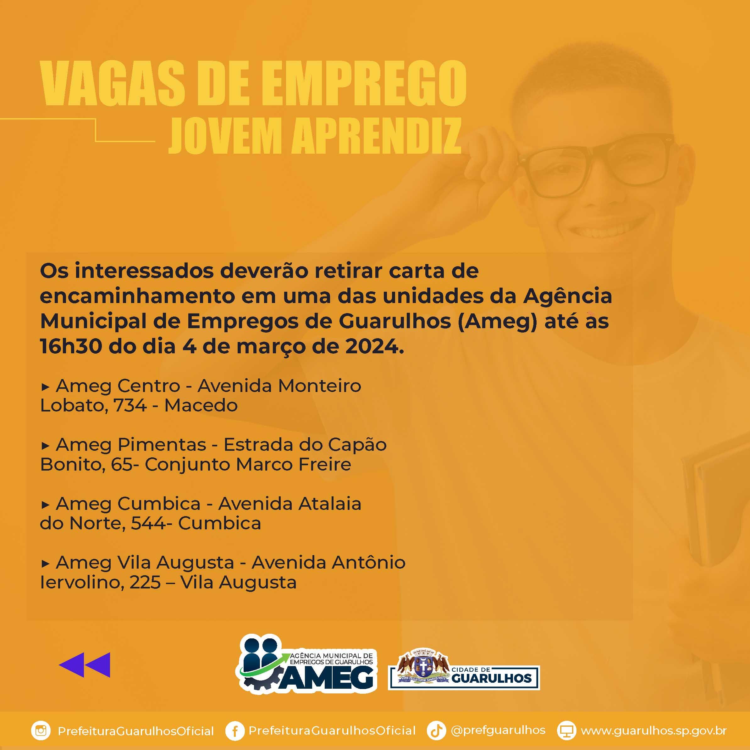 A Agência Municipal de Empregos de Guarulhos (Ameg) receberá até o dia 4 de março as inscrições para vagas de emprego de jovem aprendiz direcionadas a pessoas de 16 a 22 anos. Os interessados têm até a data-limite para retirar a carta de encaminhamento em uma das unidades da agência. Caso as vagas atinjam o limite de encaminhamentos antes de 4 de março não serão mais aceitas inscrições.