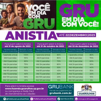 O interessado poderá obter o desconto se optar por pagar a dívida em parcela única. Caso o parcelamento ocorra em seis vezes, o desconto será de 90%, contra 80% para a opção por 12 meses. A adesão à anistia deve ser feita pelo site https://fazenda.guarulhos.sp.gov.br ou em uma das unidades da Rede Fácil de Atendimento ao Cidadão, cujos endereços podem ser verificados em