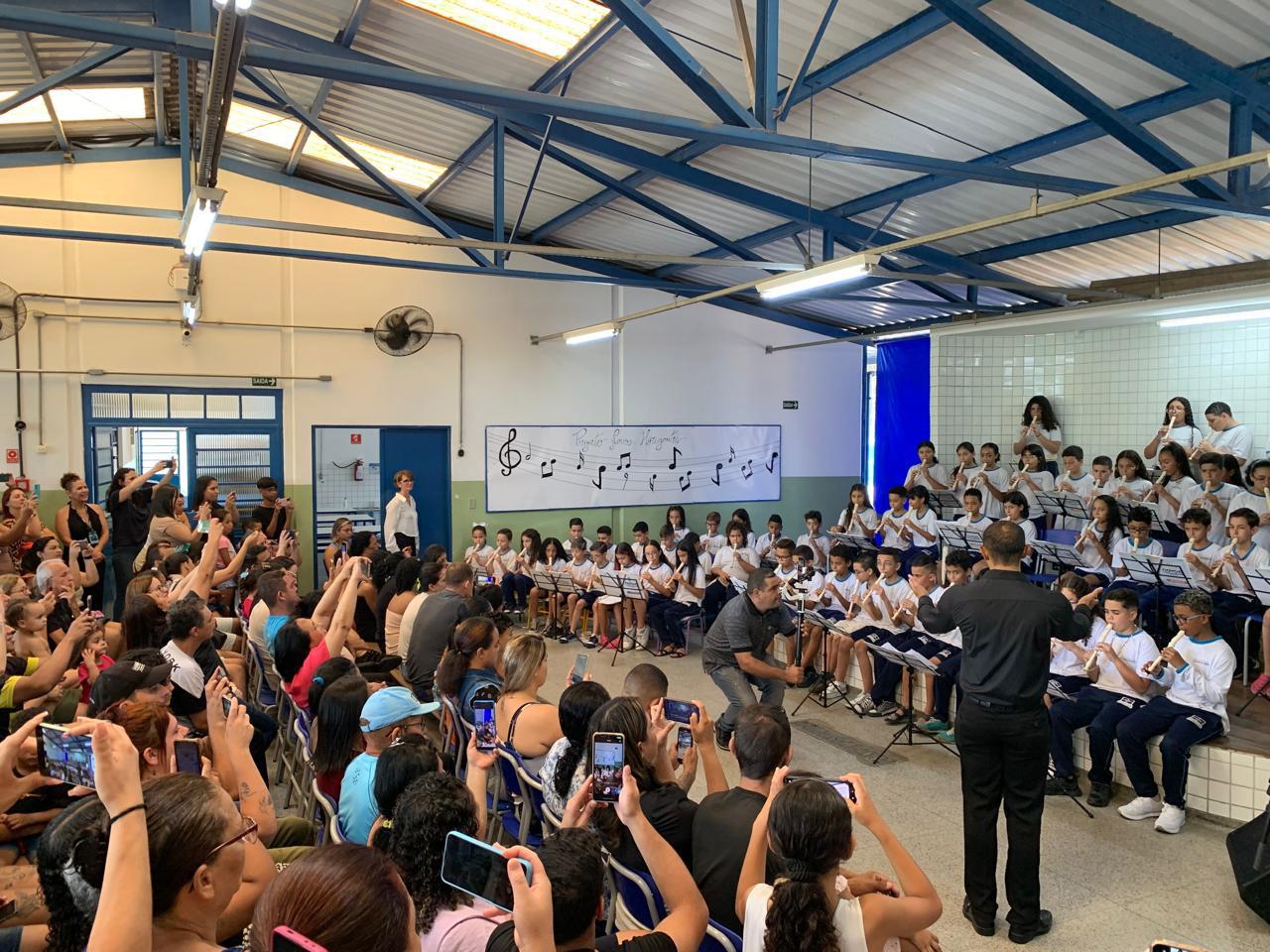 A EPG Inêz Rizzatto Rodrigues promoveu no último sábado (7) uma apresentação dos alunos participantes do projeto Novos Horizontes, oficinas de iniciação musical com foco no estudo da flauta doce. Além de dar um passo importante no desenvolvimento de saberes do universo musical, o projeto atende crianças em locais com maior vulnerabilidade social e incentiva o interesse por outros tipos de arte e cultura.