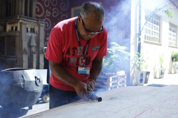 Para que cada um dos elementos de cena adquira formato de espadas, coroas, caldeirão, trono, árvores, floresta, entre outros, o papelão bruto é tratado de forma bastante especial, com camadas de papel, cola, tinta e verniz. Esse trabalho exige, além de técnica, atenção aos mínimos detalhes, que somados a toda a produção musical e artística, prometem encantar o público no Adamastor.