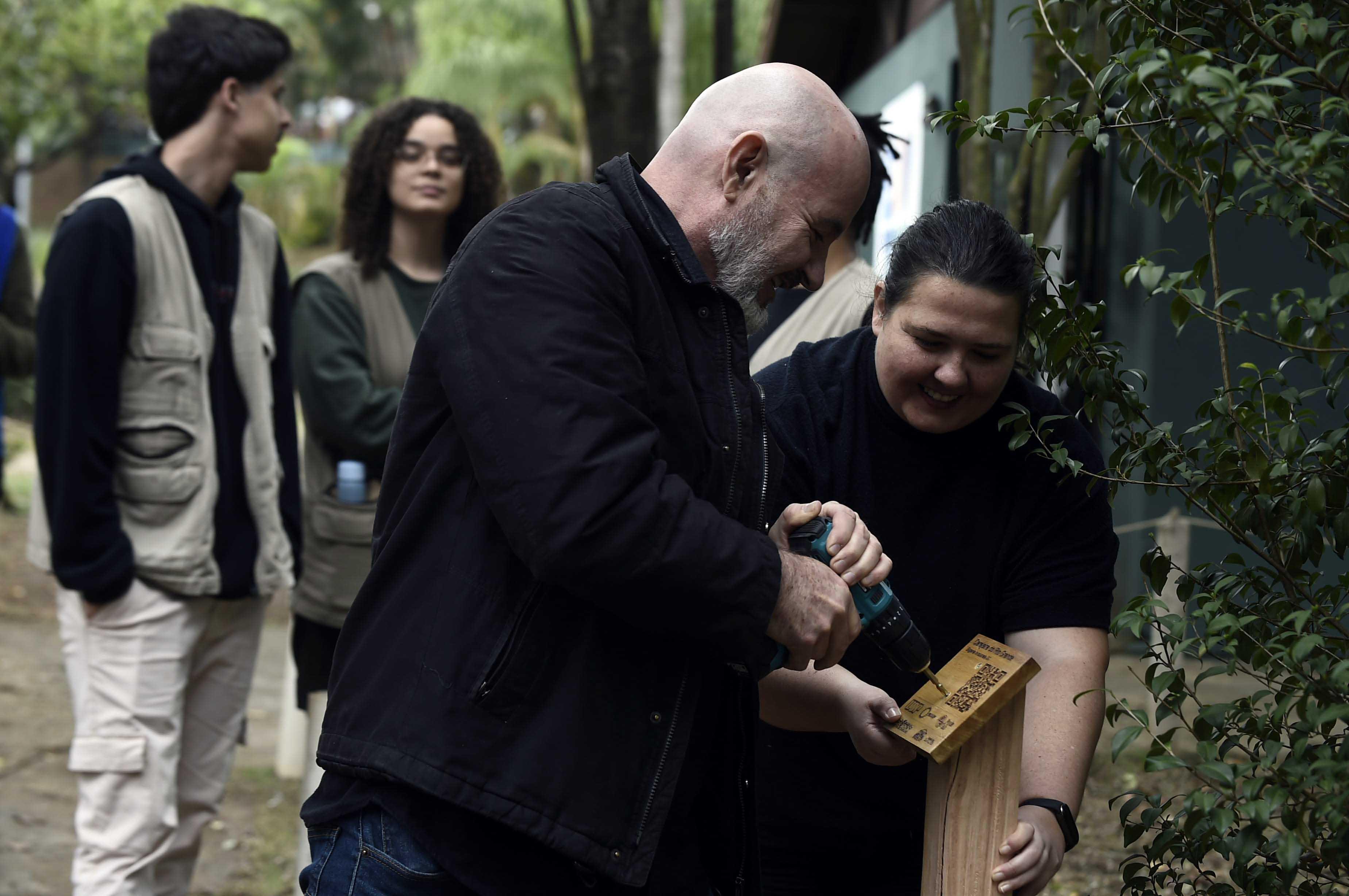 Também acompanharam a instalação das placas a equipe de educação ambiental do Zoológico, a professora da FAU, Fernanda Gomes Fausti, e a estudante de arquitetura, urbanismo e design Fernanda Kapila.