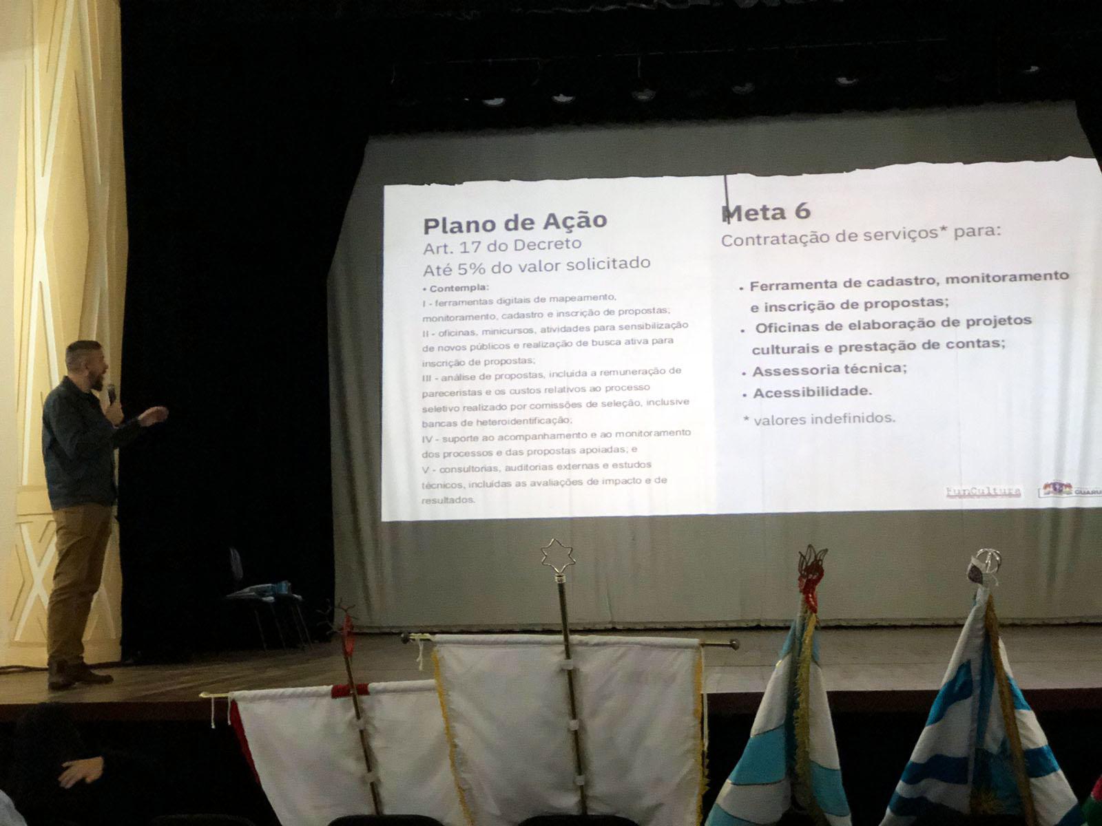 A Secretaria de Cultura apresentou a 1ª versão do plano de ação para a implementação da lei no município, tratou de prazos e previsões. Os participantes puderam tirar dúvidas e apresentar sugestões para alterações do plano de ação.