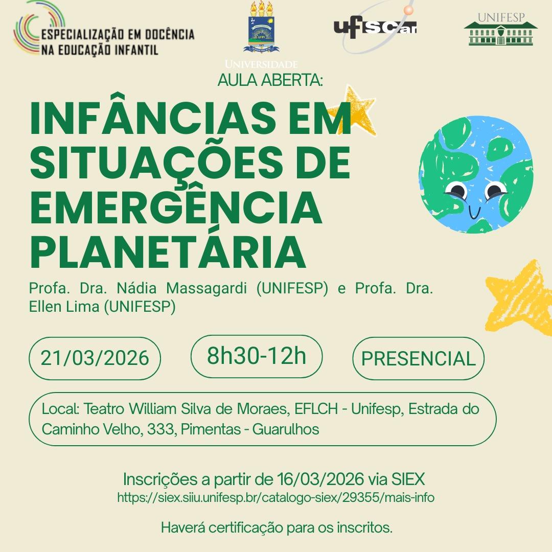 Neste sábado (21), das 8h30 às 12h, acontece aula aberta do curso de Especialização em Docência na Educação Infantil, iniciativa da Universidade Federal do Piauí (UFPI) que na região Sudeste II conta com turma no polo da Universidade Federal de São Paulo (Unifesp), campus Guarulhos, no bairro dos Pimentas. Para participar, os interessados devem se inscrever pelo site https://siex.siiu.unifesp.br/catalogo-siex/29355/mais-info.