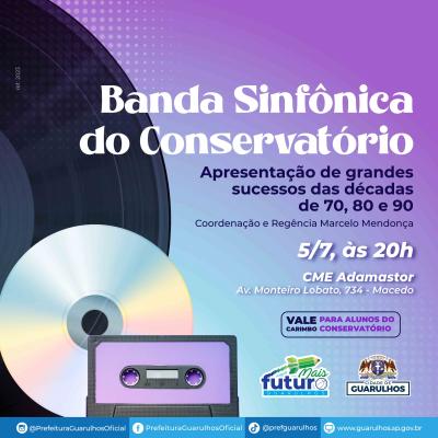 Grandes sucessos das décadas de 1970, 80 e 90, com músicas populares que marcaram gerações e ainda hoje ressaltam um dos períodos mais efervescentes da história do país, compõem o repertório do espetáculo da Banda Sinfônica do Conservatório Municipal de Guarulhos que acontece na próxima quarta-feira (5), às 20h, no Teatro Adamastor. O evento é gratuito e tem classificação livre.