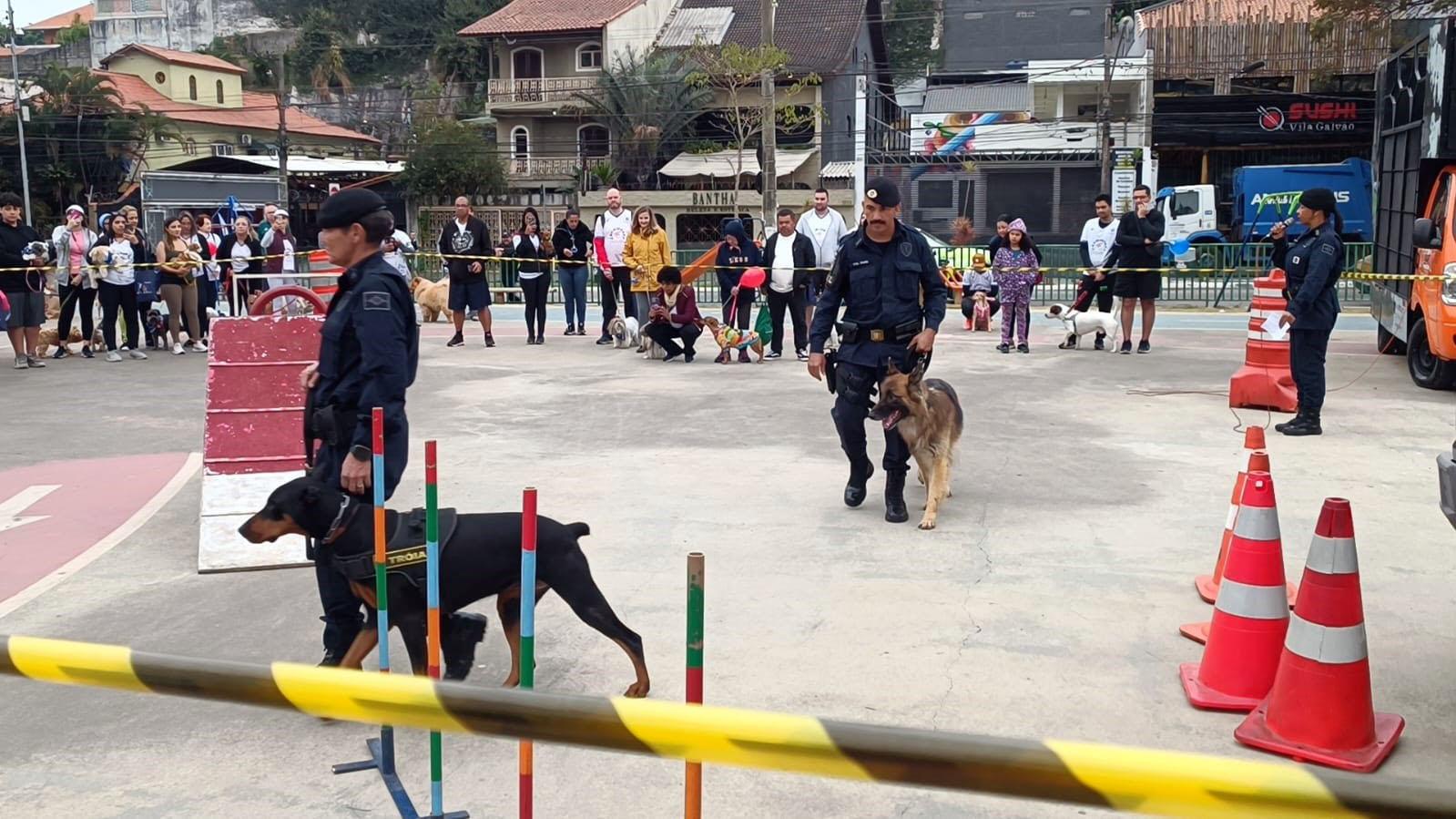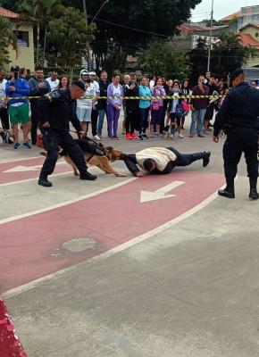 Em seguida, os agentes se deslocaram à praça Luis Alves de Lima e Silva, conhecida como Piscinão da Vila Galvão, para participarem do evento Cãominhada, uma parceria com o Flor de Lótus Centro de Reabilitação Veterinária. Os animais do Canil da GCM mostraram agilidade, destreza e obediência sob o comando de seus condutores.