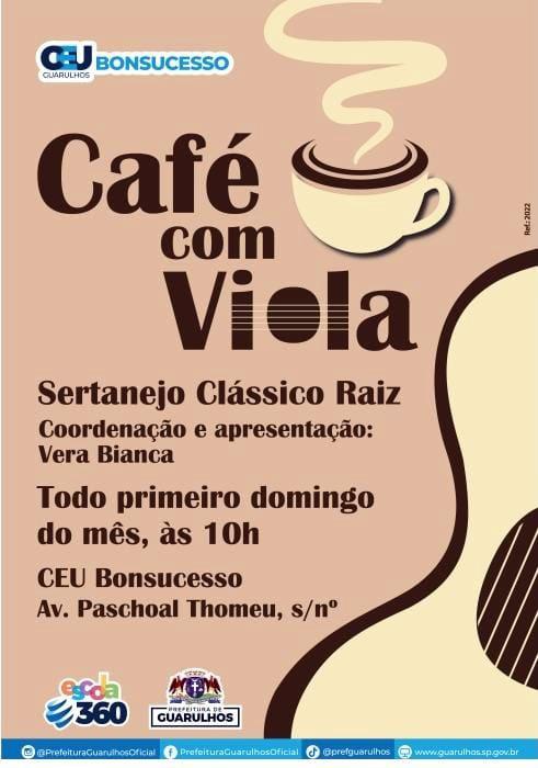 O Café com Viola apresenta especial do mês internacional da mulher no próximo domingo (5), às 10h, no CEU Bonsucesso. Para marcar e relembrar esse dia de luta, a coordenadora e apresentadora Vera Bianca recebe o público com saboroso café, bolo de fubá e música caipira da melhor qualidade. O evento tem entrada gratuita e classificação livre.