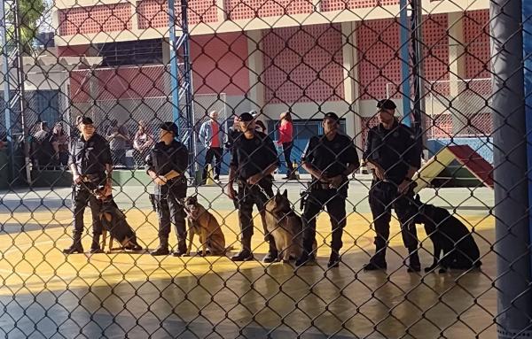 A Guarda Civil Municipal (GCM) de Guarulhos desenvolveu nesta quinta-feira (25) uma apresentação interativa das habilidades especiais de cães policiais com alunos da Escola Estadual Professora Alice Chuery, no Jardim São Jorge. Eles puderam conhecer de perto como esses animais respondem rapidamente aos comandos de seus adestradores.