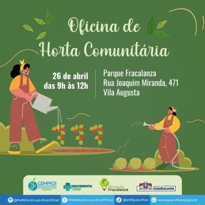 No dia 26, das 9h às 12h, interessados a partir dos 16 anos poderão se inscrever para a oficina de horta dada pela equipe de agricultura urbana da Divisão de Educação Ambiental da Secretaria de Serviços Públicos em parceria com o Cempics. Na atividade serão ensinadas técnicas de compostagem e cultivo, nutrição vegetal e conservação de solo, visando a estimular a prática do plantio do próprio alimento, promovendo economia, segurança alimentar, saúde e ainda a possibilidade de geração de renda alternativa. Interessados devem se inscrever pelo link bit.ly/OficinadeHortasGru.