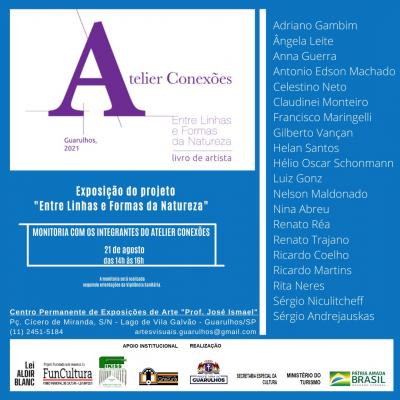 Os artistas plásticos Adriano Gambim, Antônio Edson Machado, Nelson Maldonado e Sergio Andrejauskas, integrantes do Atelier Conexões, fazem monitoria da exposição Entre Linhas e Formas da Natureza neste sábado (21), das 14h às 16h, no Centro de Exposições de Arte Prof. José Ismael, na Vila Galvão. A entrada é gratuita e a classificação, livre.