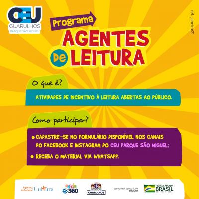 O programa Agentes de Leitura é fruto de um convênio entre a Prefeitura de Guarulhos, a Secretaria de Cultura e o governo federal, por meio da Secretaria Especial da Cultura. Em parceria com a Escola 360, o projeto tem como foco estimular ações literárias e colaborar com o desenvolvimento humano mediante o acesso aos serviços culturais nos locais de alta vulnerabilidade social de Guarulhos.