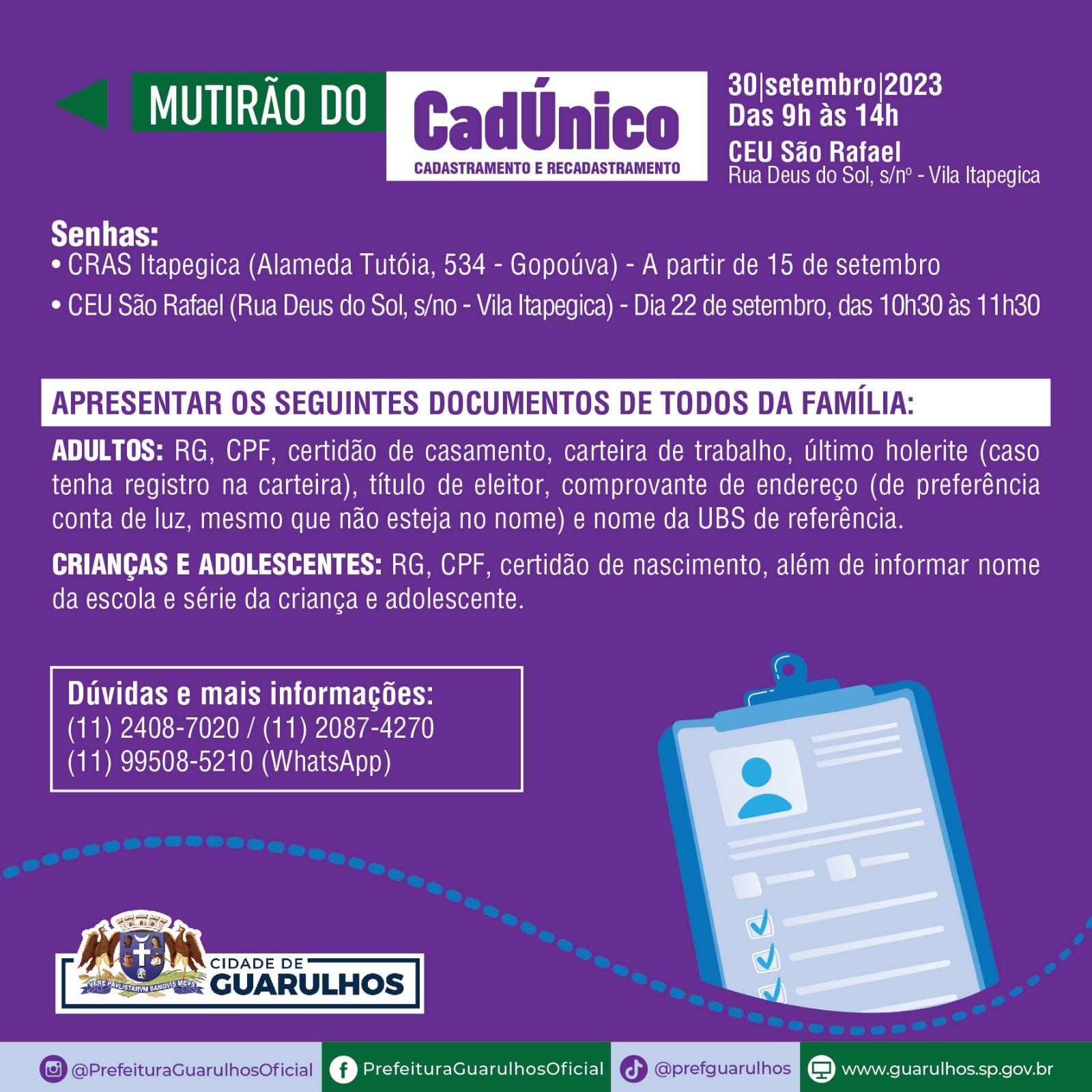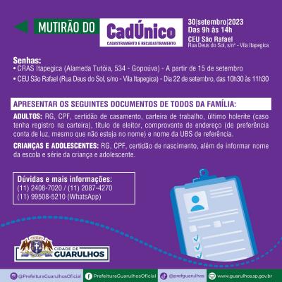 No último sábado do mês de setembro, dia 30, o CEU São Rafael abrigará a próxima edição do Mutirão do CadÚnico. O evento recebe a população entre 9h e 14h para novas inscrições no Cadastro Único para Programas Sociais e também para a atualização de informações previamente fornecidas.