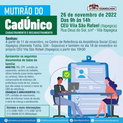 A população da região próxima ao CEU Vila São Rafael-Itapegica poderá participar da próxima edição do Mutirão do CadÚnico, que acontecerá no local no dia 26 de novembro das 9h às 14h. As equipes da Secretaria de Desenvolvimento e Assistência Social de Guarulhos estarão no local para fazer novos cadastros no sistema e também atualizar os dados fornecidos anteriormente. O Cadastro Único para Programas Sociais é a principal porta de entrada para o recebimento de diversos benefícios municipais, estaduais e federais.