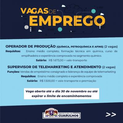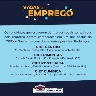 O Centro Integrado de Emprego, Trabalho e Renda (Ciet) da Prefeitura de Guarulhos divulgou nesta sexta-feira (19) 34 vagas de emprego em diversas áreas de atuação.