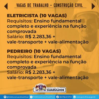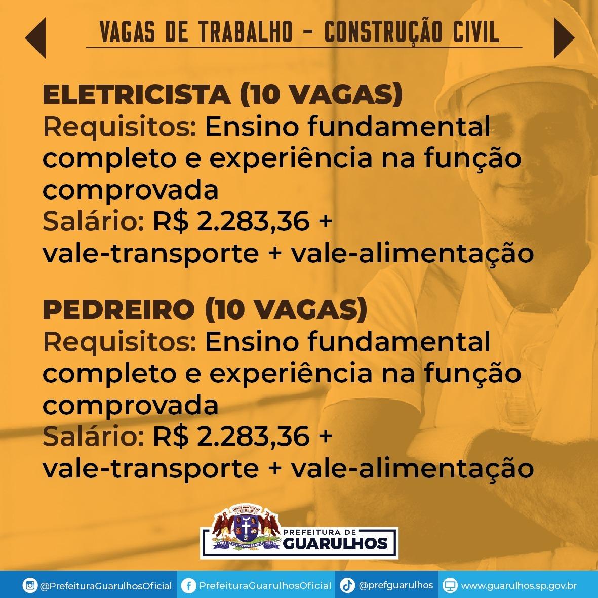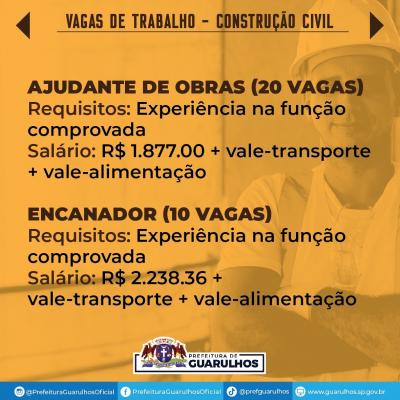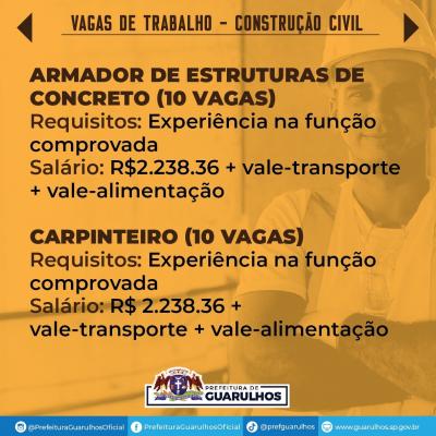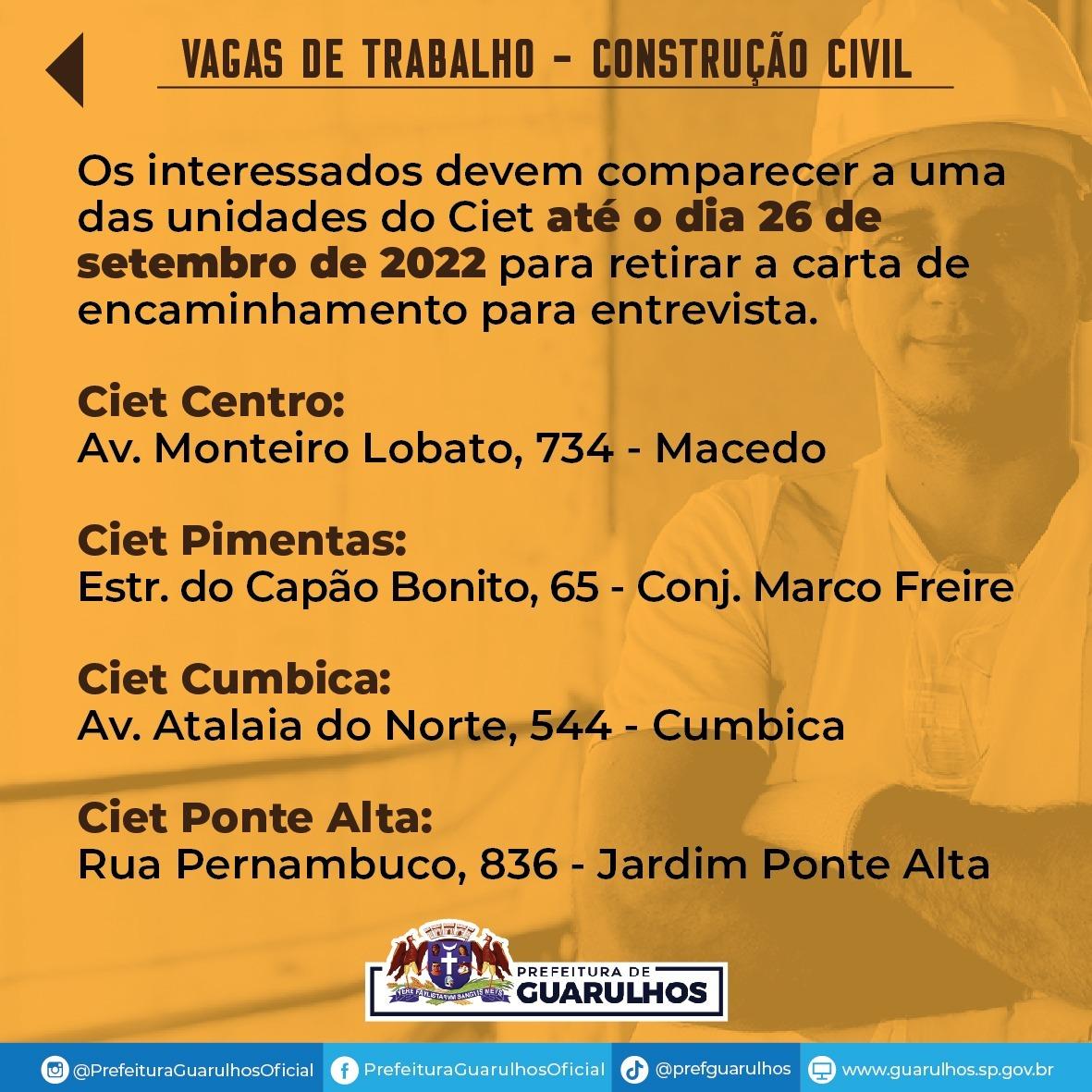 O Centro Integrado de Emprego, Trabalho e Renda (Ciet) de Guarulhos divulgou nesta sexta-feira (23) 70 vagas de emprego para trabalhar na construção civil.