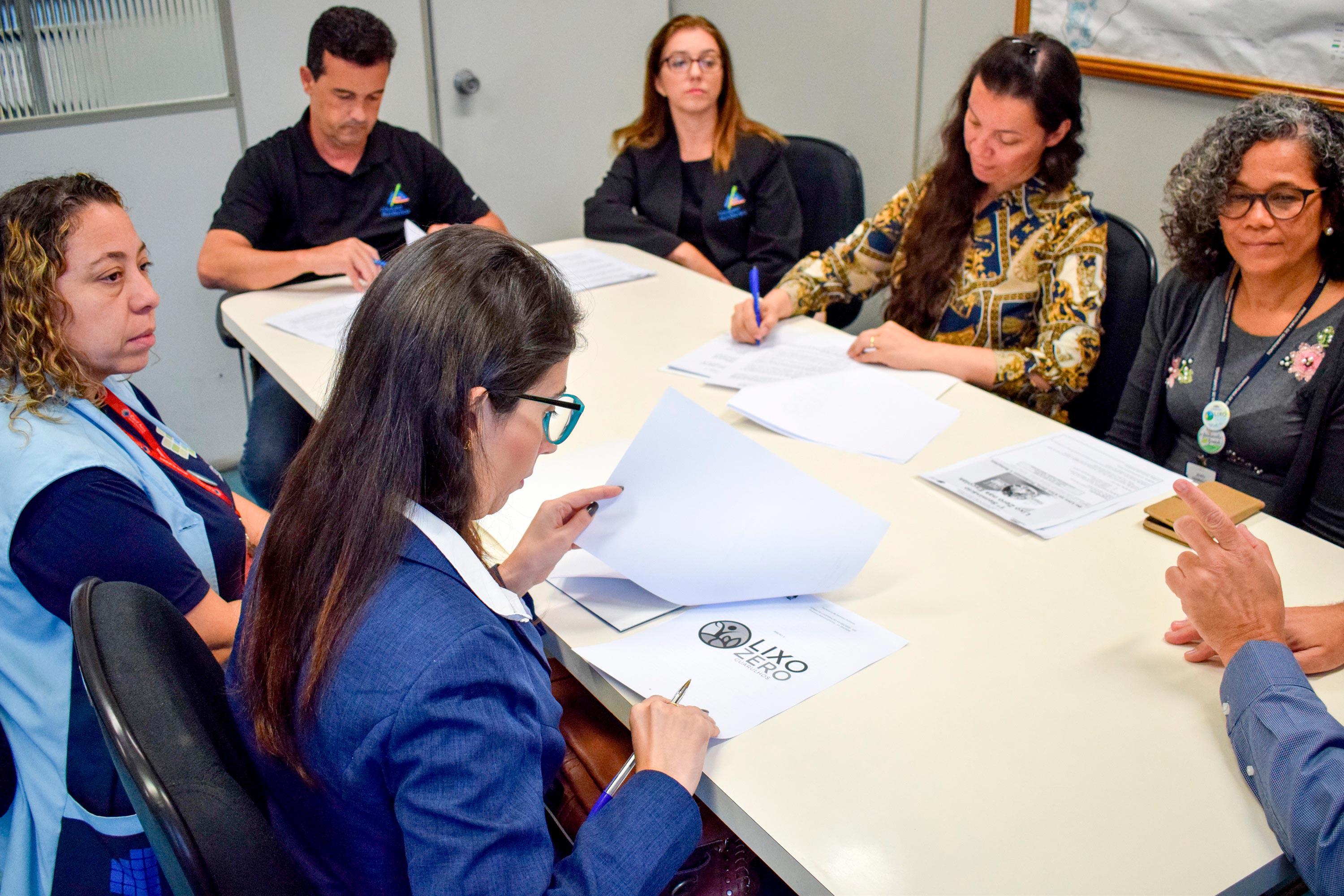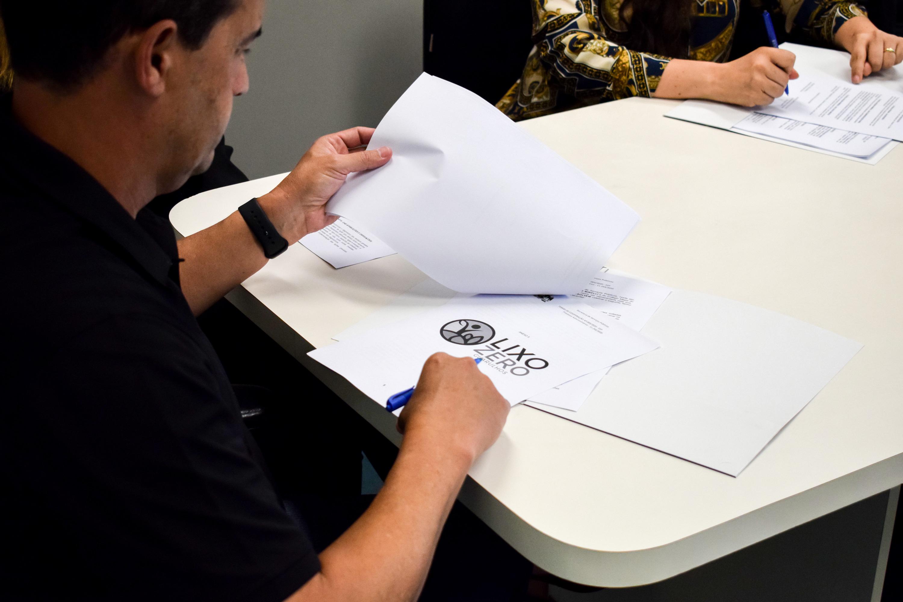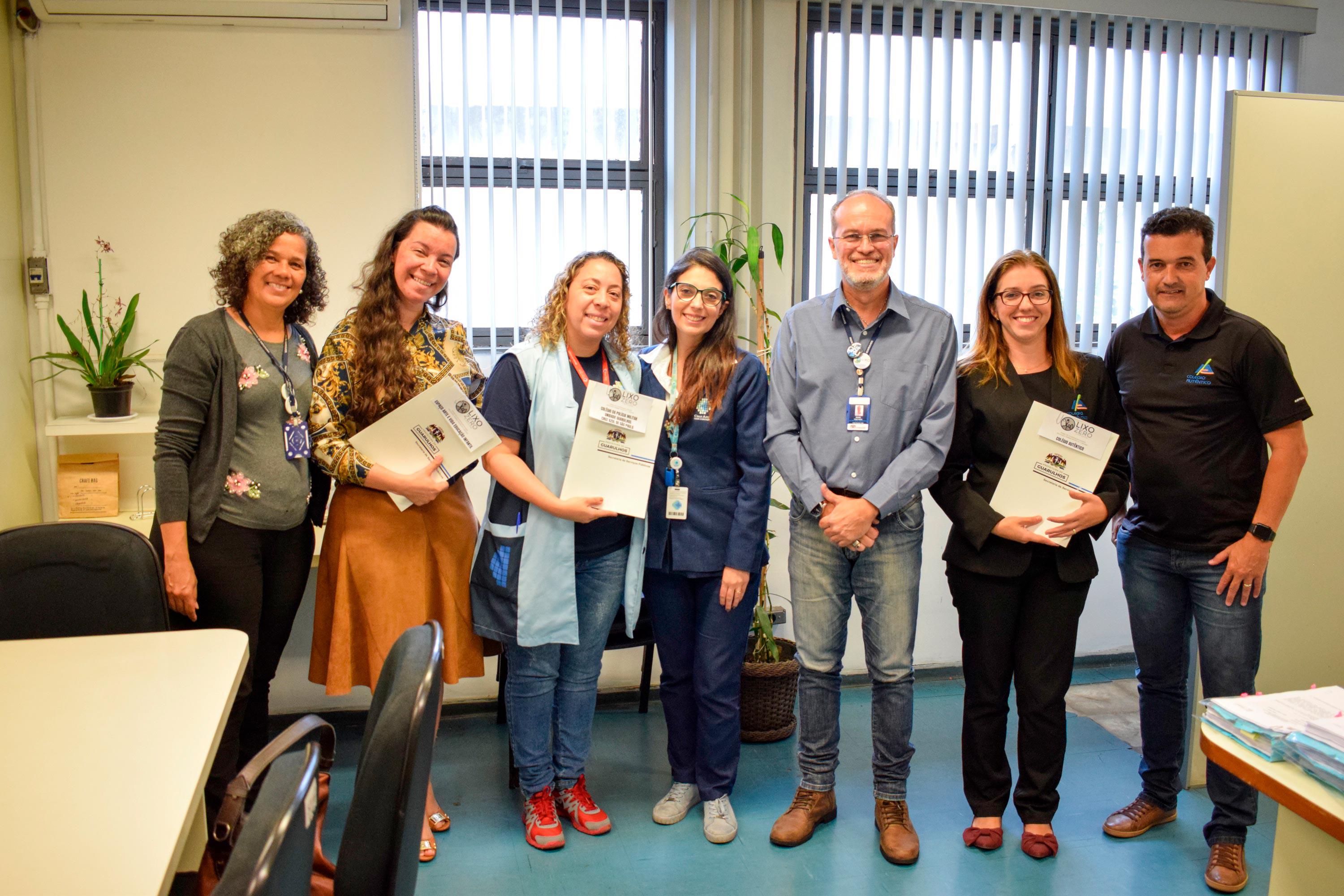 Representantes dos colégios da Polícia Militar de Guarulhos, Autêntico e Espaço Arte e Vida Educação Infantil assinaram nesta terça-feira (3) o termo de cooperação Escola Lixo Zero. As instituições de ensino são as primeiras a aderirem ao programa da Prefeitura que visa a reduzir a quantidade de lixo enviado ao aterro sanitário, através da conscientização sobre a importância da separação de materiais e de como praticá-la diariamente.