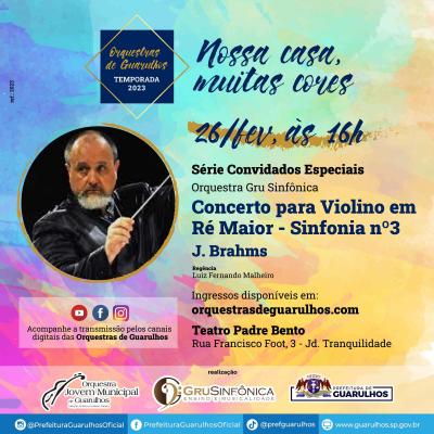 No programa, a Gru Sinfônica executa o Concerto para Violino em Ré Maior e a Sinfonia nº 3, de Brahms.