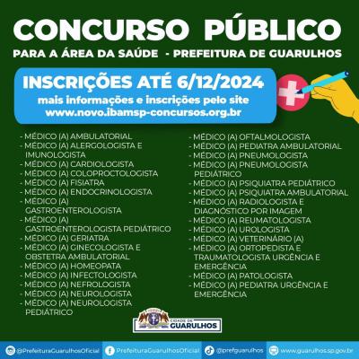 A Prefeitura de Guarulhos abriu concurso público com 31 vagas para médicos de diversas especialidades e uma para médico veterinário, cujos salários variam de R$ 5.282,56 a R$8.193,81. As inscrições devem ser feitas até o dia 6 de dezembro pela internet, no site do IBAM (www.novo.ibamsp-concursos.org.br). O valor da taxa de inscrição é de R$ 120,00. O edital completo pode ser consultado no link https://diariooficial.guarulhos.sp.gov.br/uploads/pdf/580636047.pdf