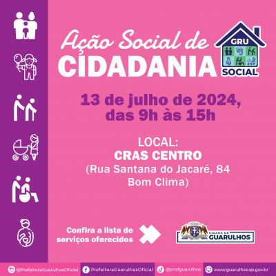 A Prefeitura de Guarulhos promoverá no dia 13 de julho (sábado) mais uma edição do GRU Social, ação de solidariedade que reúne uma extensa lista de serviços gratuitos para a população. O evento acontecerá no Centro de Referência Social (Cras) Centro, na rua Santana do Jacaré, 84, Jardim Bom Clima, das 9h às 15h.