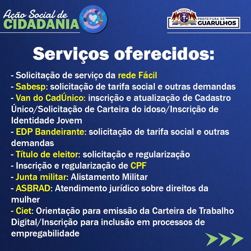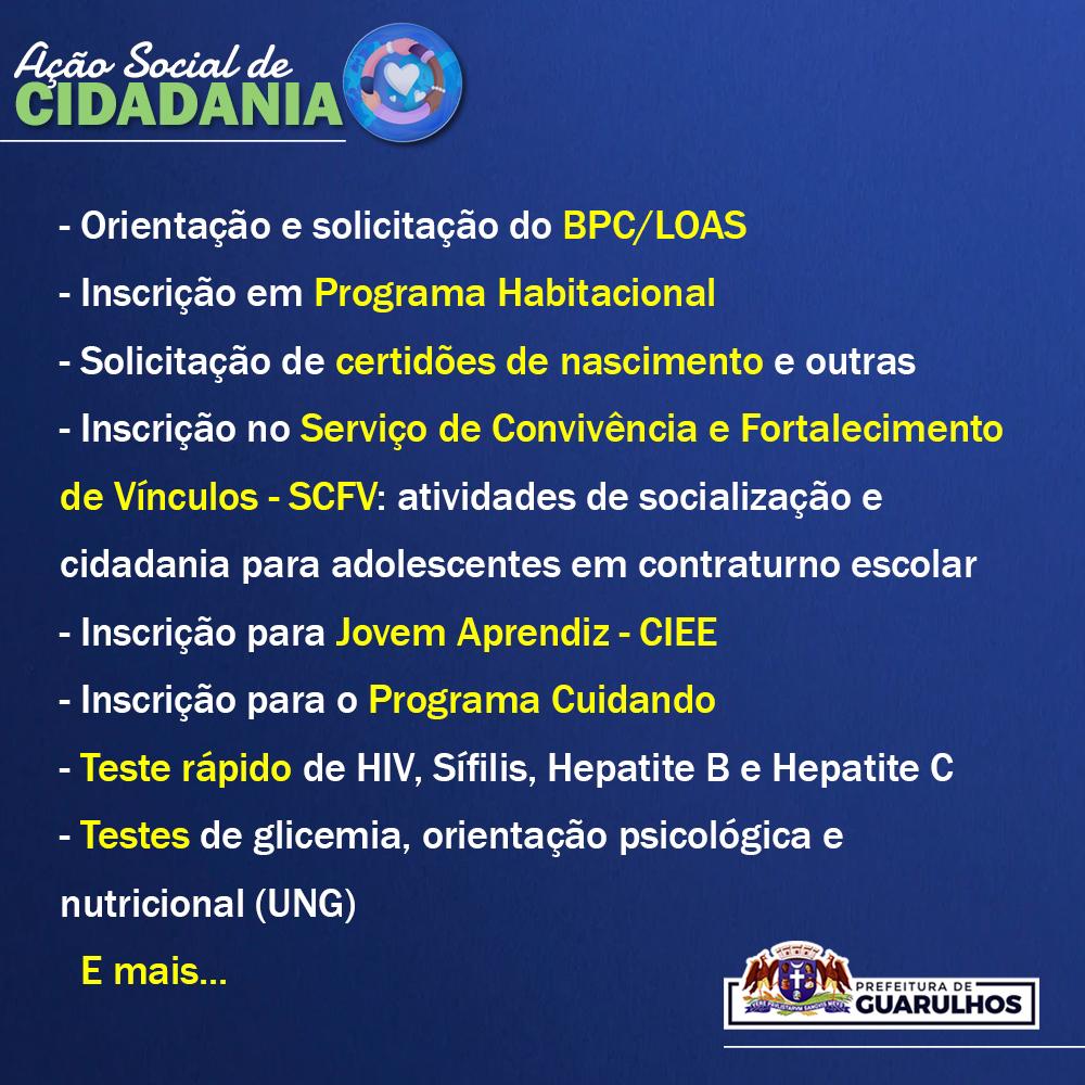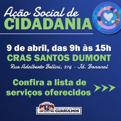 Os moradores da região do Parque Santos Dumont poderão participar no próximo dia 9 de abril da Ação Social de Cidadania, evento organizado pela Prefeitura de Guarulhos por meio da Secretaria de Desenvolvimento e Assistência Social (SDAS). A ação ocorrerá das 9h às 15h e contará com diversos serviços, tanto municipais quanto de parceiros, que serão gratuitos.