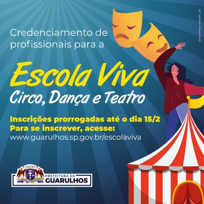 A Prefeitura de Guarulhos prorrogou até 15 de fevereiro as inscrições para a Escola Viva de Artes Cênicas. Destinado a profissionais da área de artes cênicas, o edital seleciona artistas interessados em apresentar propostas de formação em circo, dança e teatro.