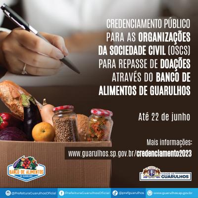 A Prefeitura de Guarulhos disponibilizará até 22 de junho o credenciamento público para as organizações da sociedade civil (OSCs) que desejam receber repasse de doações por meio do Banco de Alimentos. O edital completo, o calendário e demais informações estão no link https://www.guarulhos.sp.gov.br/credenciamento2023.