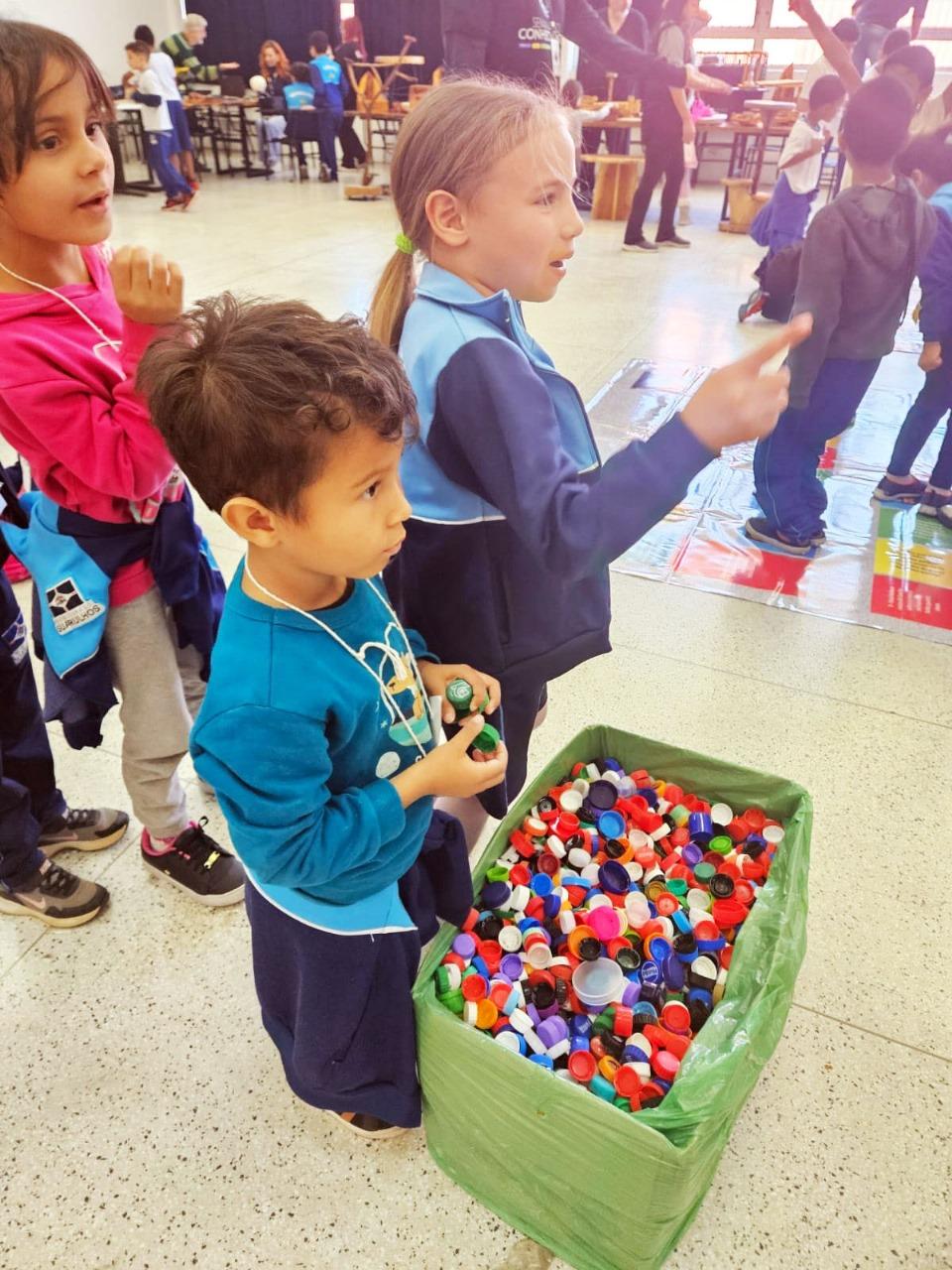 Durante manhã e tarde, os pequenos se divertiram enquanto assimilavam conceitos de sustentabilidade em um espaço com diversos jogos e brincadeiras para despertar a conscientização ambiental. Um dos preferidos foi a tampinha ao alvo, no qual as crianças participaram de uma gincana com o objetivo de acertar as tampinhas coloridas nos buracos de cores correspondentes.