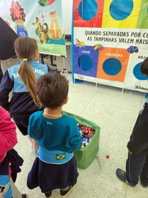 Mas não somente as crianças estavam empolgadas, Nádia Barbosa de Macedo, professora do estágio 2 da EPG Maria Isabel de Assis, também vibrou junto com sua turma. Ela achou a experiência maravilhosa e quer levar esta ideia pra escola, a fim de mostrar para os pais e incluir no programa de reciclagem. Gostou também da separação de tampinhas por cores, que é simples, mas sensacional para desenvolver muitas atividades.