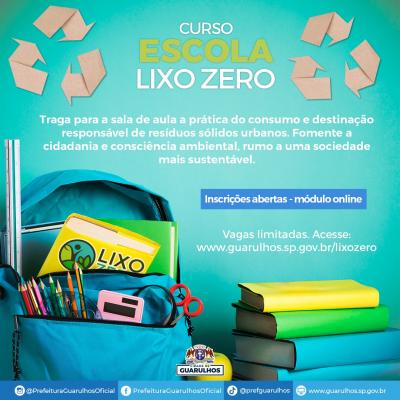 Estão abertas, pelo link http://www.guarulhos.sp.gov.br/lixozero, as inscrições para o módulo online do curso gratuito Escola Lixo Zero para professores, coordenadores e gestores de ensino das redes pública e privada que queiram implementar, em sua comunidade escolar, projetos de sustentabilidade em relação à gestão de resíduos sólidos por meio da separação e destinação correta de materiais recicláveis e da compostagem de restos orgânicos.