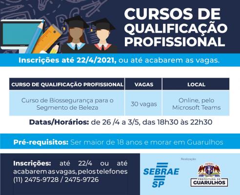 A Secretaria do Trabalho de Guarulhos, em parceria com o Serviço Brasileiro de Apoio às Micro e Pequenas Empresas (Sebrae), receberá até o dia 22 de abril as inscrições para o curso Biossegurança para o Segmento de Beleza. São 30 vagas disponíveis e as inscrições podem ser feitas pelos telefones 2475-9728/9726. É necessário ser maior de 18 anos e morar em Guarulhos.