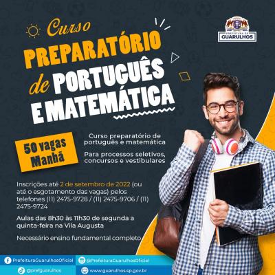 Aqueles que desejam se preparar para processos seletivos, concursos e vestibulares agora têm mais uma chance de estudar. A Prefeitura de Guarulhos receberá até esta sexta-feira (2) as inscrições para as 50 vagas no curso preparatório de português e matemática. Os interessados devem entrar em contato pelos telefones 2475-9728 / 2475-9706 / 2475-9724, da Secretaria do Trabalho, e informar nome completo, CPF, RG, endereço e escolaridade.