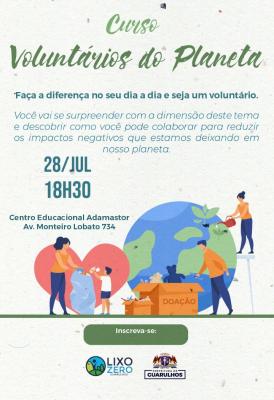 A Prefeitura de Guarulhos realiza nesta quinta-feira (28) o curso aberto Voluntários do Planeta, das 18h30 às 21h30, no Adamastor (avenida Monteiro Lobato, 734, Macedo). A participação é livre e gratuita, mediante inscrições pelo link https://bit.ly/3PY4nsY