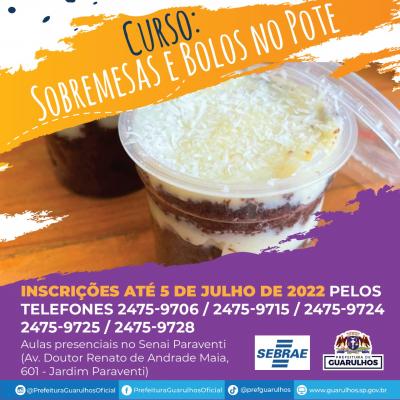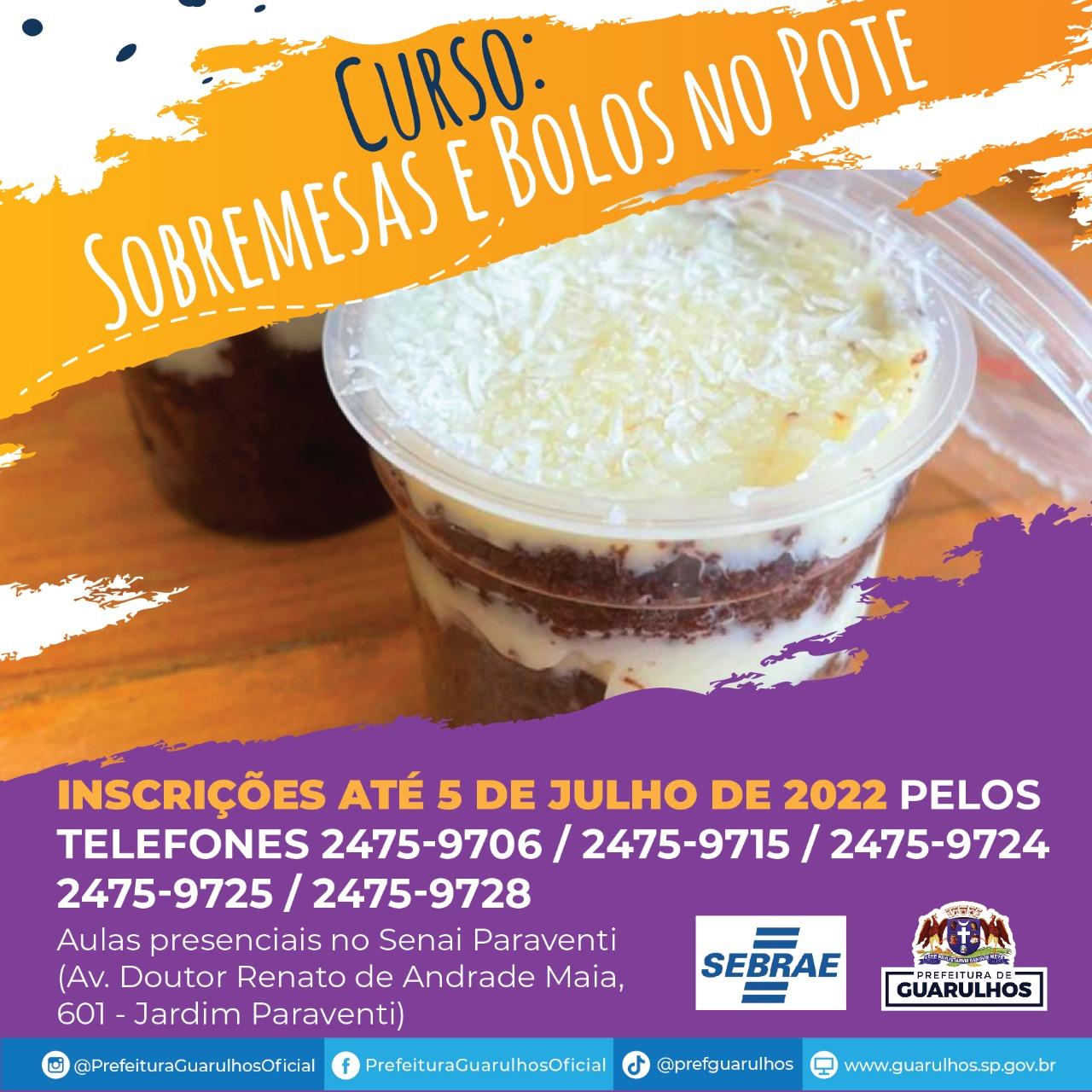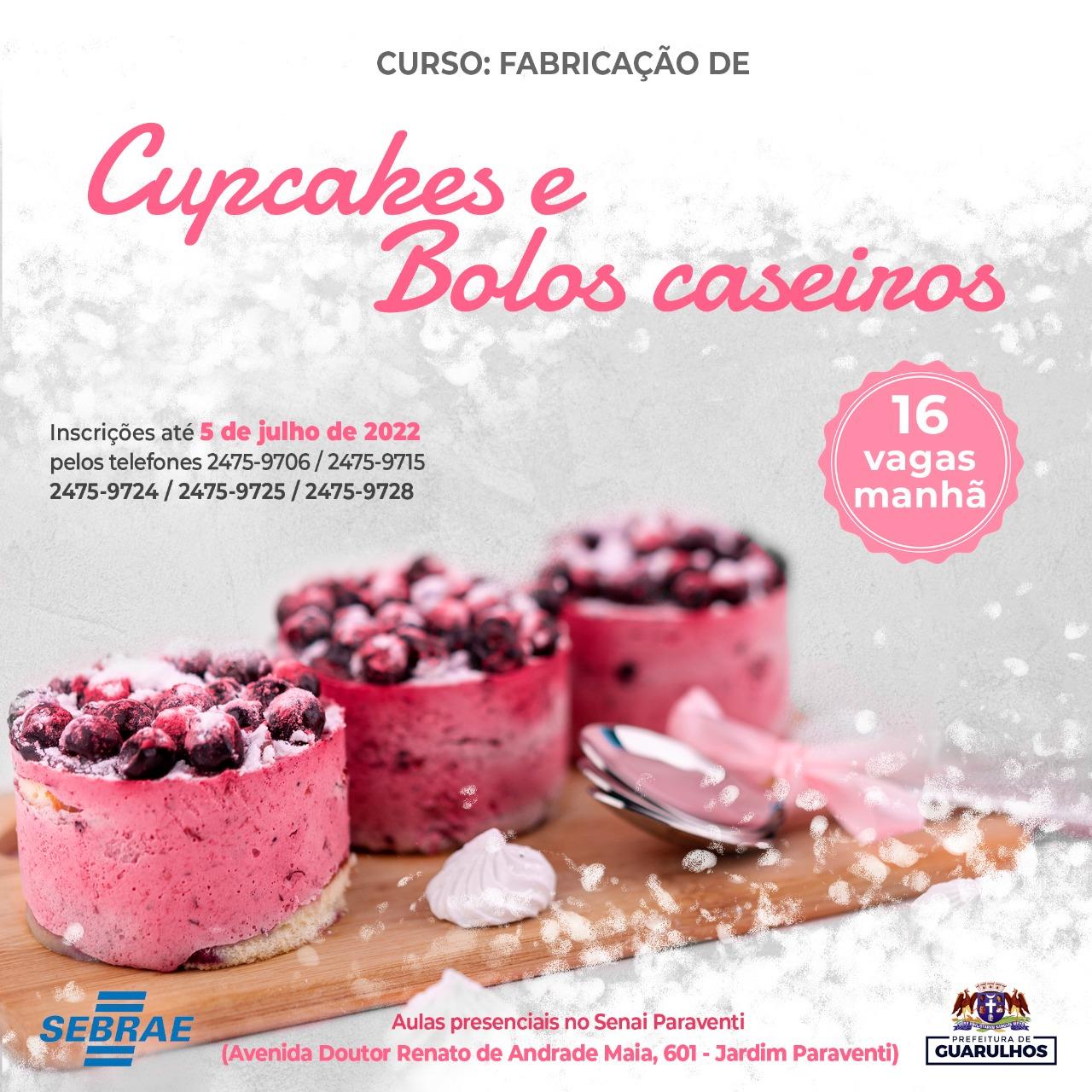 Estão abertas até o próximo dia 5 de julho as inscrições para os cursos de fabricação de cupcakes e bolos caseiros (16 vagas) e sobremesas e bolos no pote (16 vagas). Os interessados devem entrar em contato pelos telefones 2475-9706 / 2475-9715 / 2475-9724 / 2475-9725 / 2475-9728, da Secretaria do Trabalho de Guarulhos, até a data limite e informar nome completo, RG, CPF e endereço.