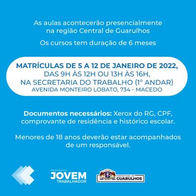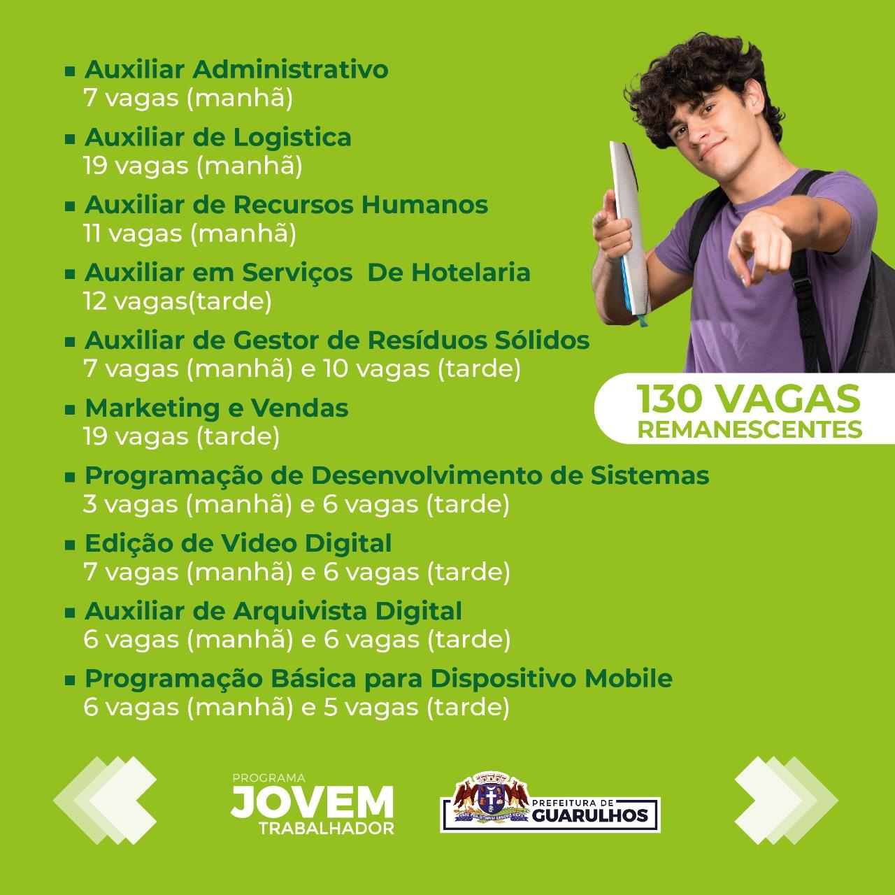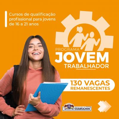 O Programa Jovem Trabalhador receberá até o dia 12 de janeiro inscrições para suas 130 vagas remanescentes. Para se inscrever é necessário ter entre 16 e 21 anos e comparecer, das 9h às 12h ou 13h às 16h, à Secretaria do Trabalho de Guarulhos (avenida Monteiro Lobato, 734, Macedo) com cópia do RG, do CPF, do comprovante de residência e do histórico escolar. Menores de 18 anos deverão estar acompanhados de um responsável.