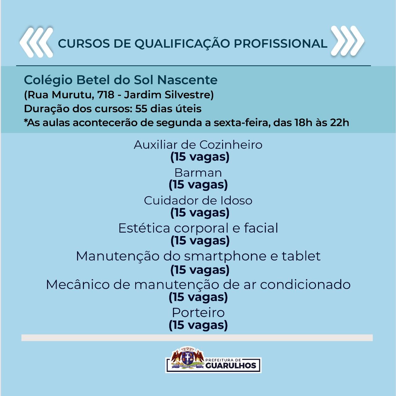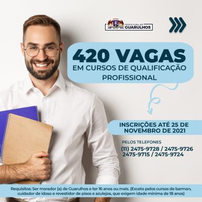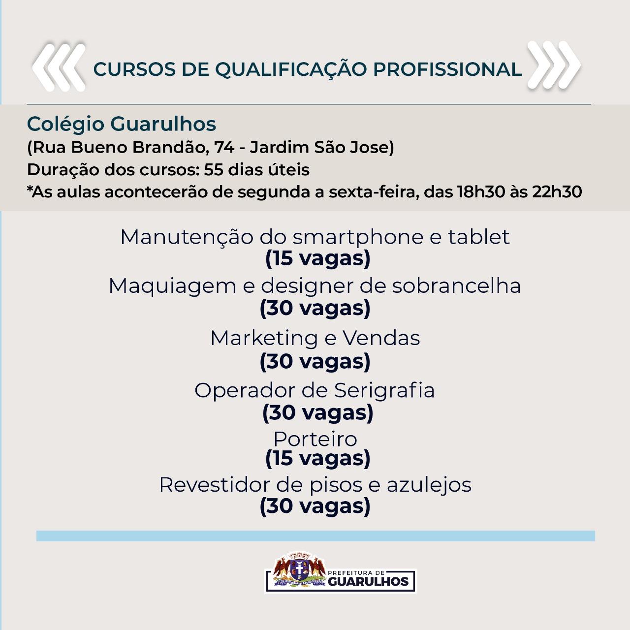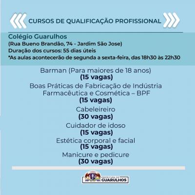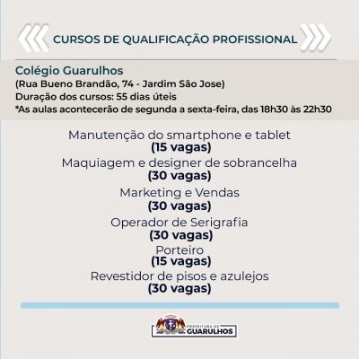 A Prefeitura de Guarulhos começou a receber nesta semana as inscrições para 420 vagas em cursos de qualificação profissional. Os interessados devem entrar em contato pelos números 2475-9728 / 2475-9726 / 2475-9715 / 2475-9724 até o dia 25 de novembro para se inscrever. A lista com o nome dos selecionados será divulgada no dia 29 pela Secretaria do Trabalho.