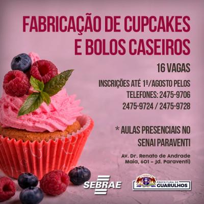 A Prefeitura de Guarulhos, em parceria com o Sebrae, receberá até o dia 1º de agosto, ou até encerrarem as vagas, as inscrições para 32 vagas em cursos gratuitos de culinária. São 16 vagas para o curso de fabricação de pães e salgados fitness e 16 para o de fabricação de cupcakes e bolos caseiros. Os interessados devem entrar em contato pelos telefones 2475-9706 / 2475-9724 / 2475-9728, da Secretaria do Trabalho.