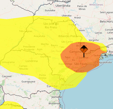 Segundo previsão do Instituto Nacional de Meteorologia (Inmet), a Região Metropolitana de São Paulo está em situação de alerta de perigo devido a precipitações intensas, o que deve permanecer durante todo o final de semana. A condição causa possibilidade de chuva entre 30 e 60 mm/h ou 50 e 100 mm/dia, ventos intensos (60-100 km/h), risco de corte de energia elétrica, queda de galhos de árvores, alagamentos e descargas elétricas.