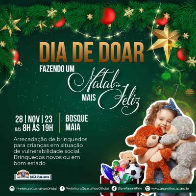 A Prefeitura de Guarulhos aderiu ao movimento Dia de Doar, que acontece mundialmente em 28 de novembro, e convida a população para participar da ação municipal que acontecerá das 8h às 19h no Bosque Maia. O objetivo é arrecadar doações de brinquedos para crianças em situação de vulnerabilidade social.