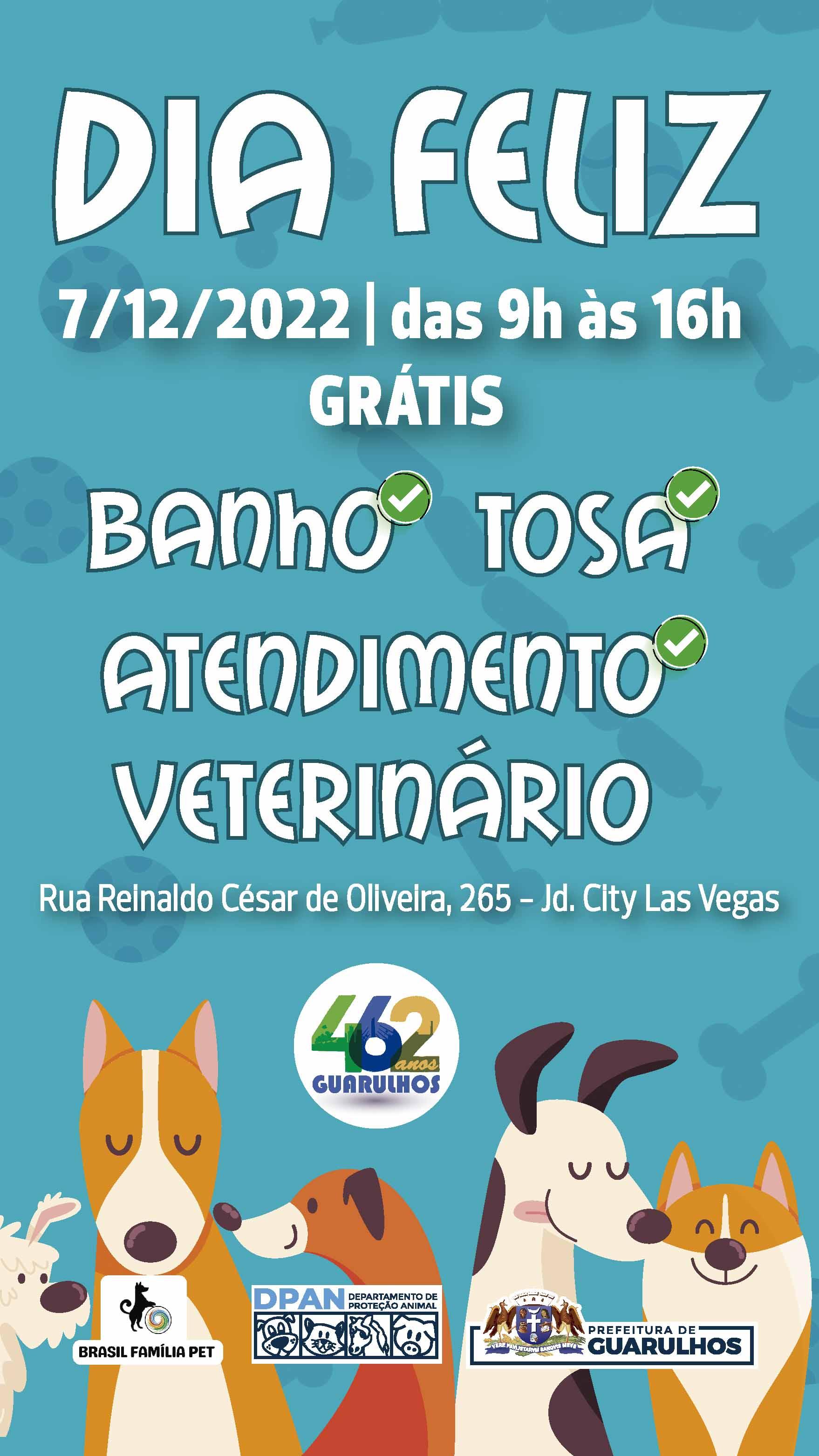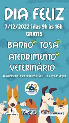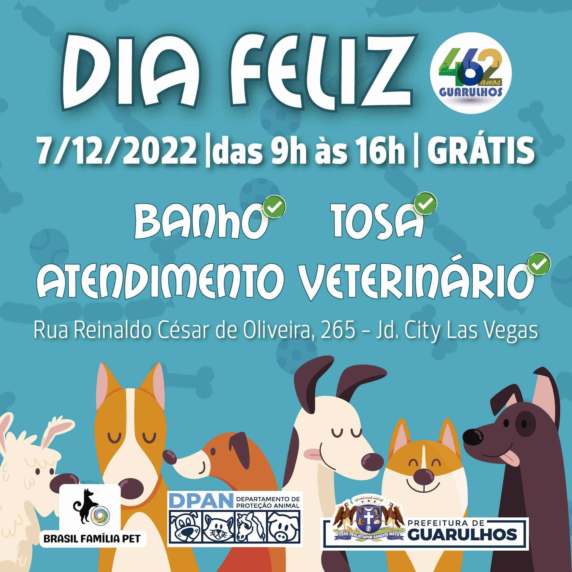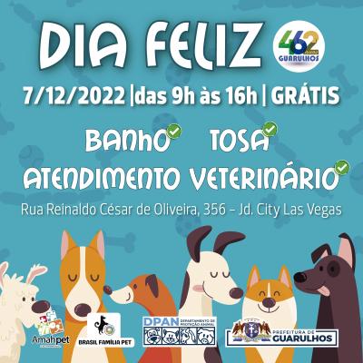 A Prefeitura de Guarulhos realiza nesta quarta-feira (7), das 9h às 16h, no parque City Las Vegas (rua Reinaldo César de Oliveira, 356 - Jardim City), o Dia Feliz, ação comunitária gratuita para cães e gatos com microchipagem (50 unidades), vacinação contra a raiva animal (50 unidades) e vermifugação, por ordem de chegada. Também serão oferecidas 12 sessões de banho e tosa gratuitas mediante agendamento pelo WhatsApp 3181-4355.