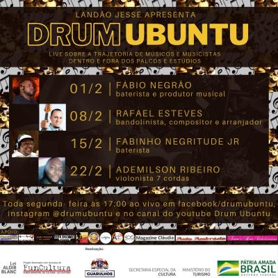 Apresentar a trajetória de músicos e musicistas diversos em um bate-papo descontraído e cheio de histórias dos palcos, estúdios e bastidores da música. Ao longo do mês de fevereiro, o baterista e percussionista Landão Jessé apresenta a live Drum Ubuntu. As apresentações online, que no mês de fevereiro acontecem nos dias 1º, 8, 15 e 22, segundas-feiras, às 17h, são transmitidas pelo canal oficial do evento no YouTube (https://www.youtube.com/channel/UCZW5KrasjqSsMQfZ054juLg).