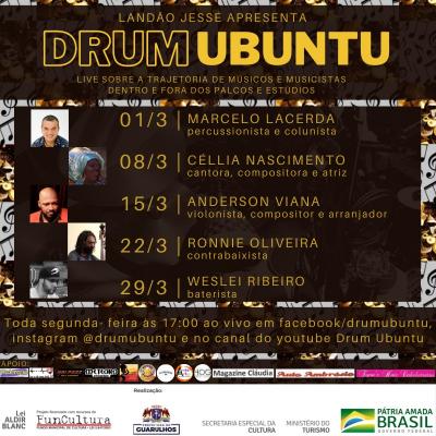 Na próxima segunda-feira (1º) a live Drum Ubuntu convida o percursionista e colunista Marcelo Lacerda. No dia 8, a cantora, compositora e atriz Célia Nascimento encanta o programa com sua presença marcante. O violinista, compositor e arranjador Anderson Viana participa do evento no dia 15. No dia 22, é a vez do contrabaixista Ronnie Oliveira distribuir seus grooves no programa. No encerramento do mês de março, o Drum Ubuntu conta com a participação do baterista Weslei Ribeiro.
