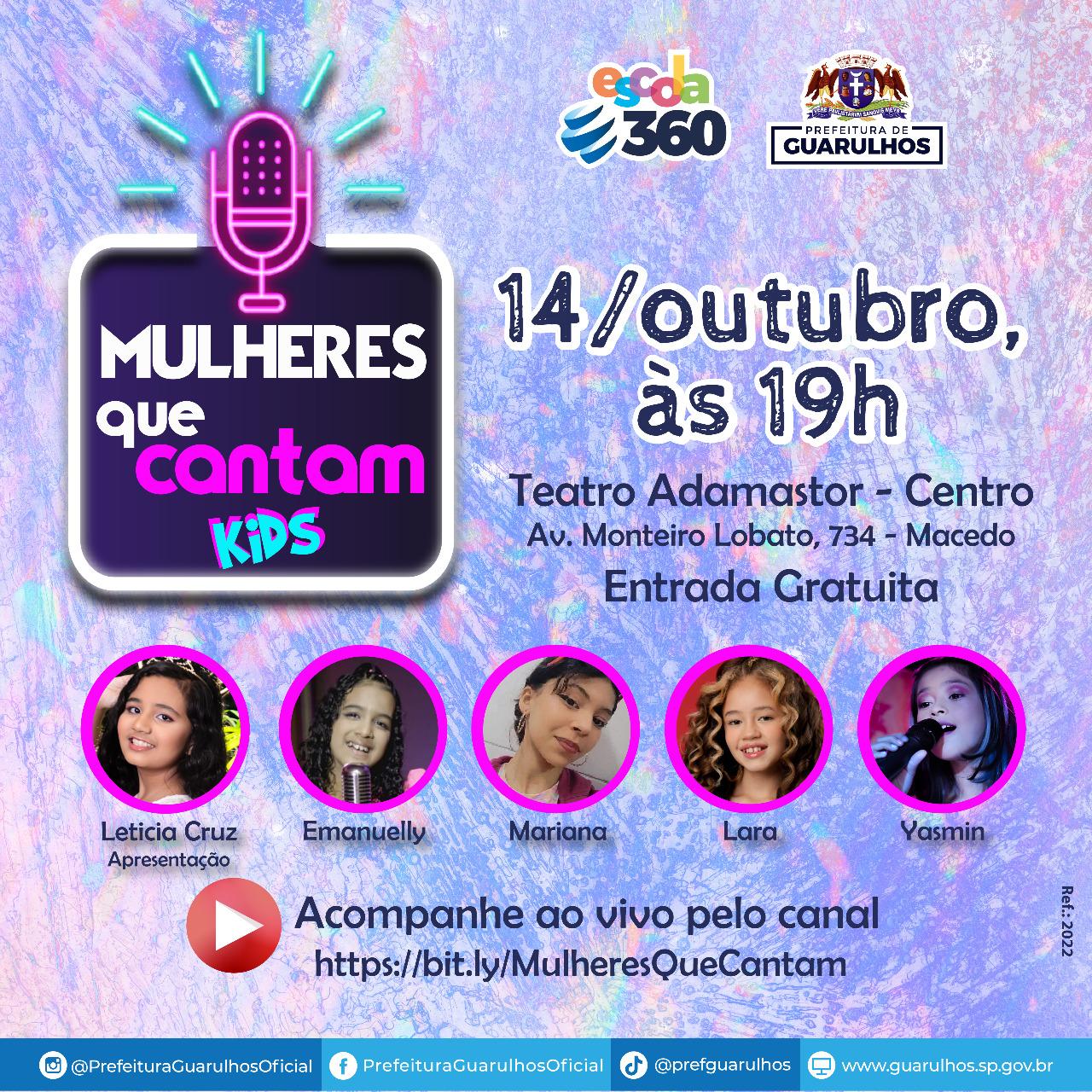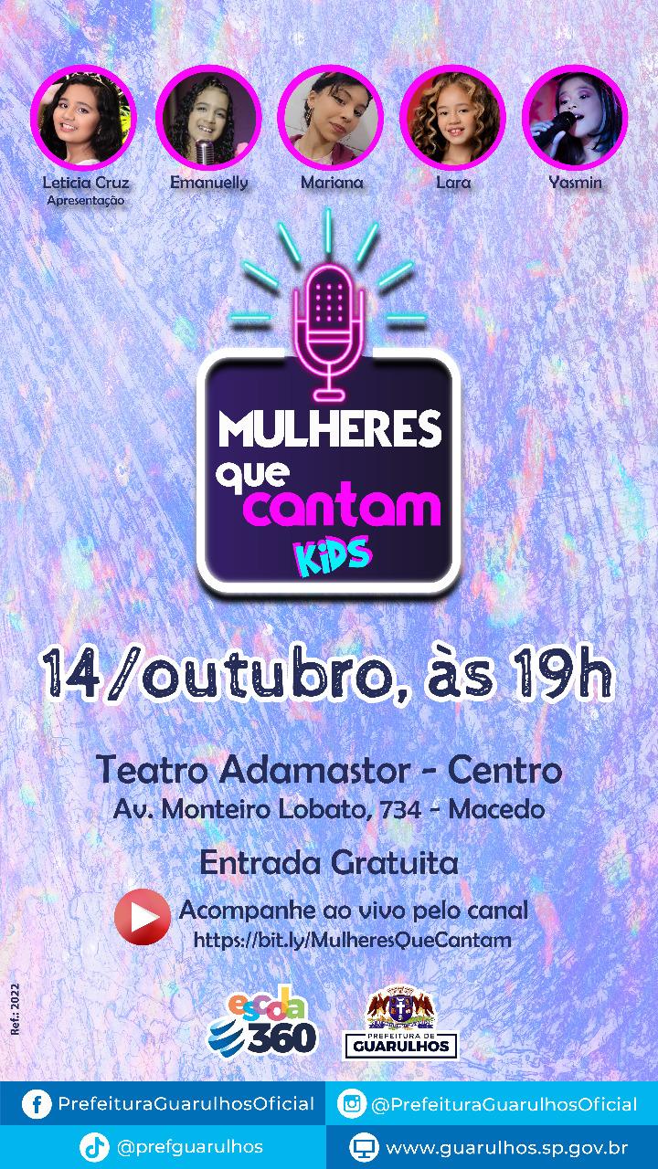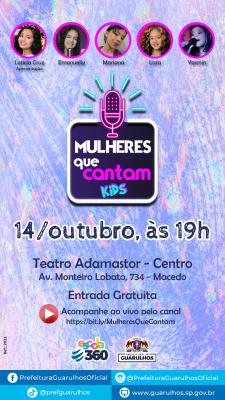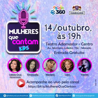 Na próxima sexta-feira (14), às 19h, o Teatro Adamastor recebe especial do programa Mulheres que Cantam, edição Kids, com a participação de quatro meninas cantoras da cidade. Além de celebrar o Dia das Crianças, o programa destaca a expressividade da voz feminina que já começa a despontar em tenra idade. O evento é aberto ao público e conta com transmissão pelo canal do projeto no YouTube (https://www.youtube.com/channel/UCSxUQsRzwQwBrTFkag186Hg).