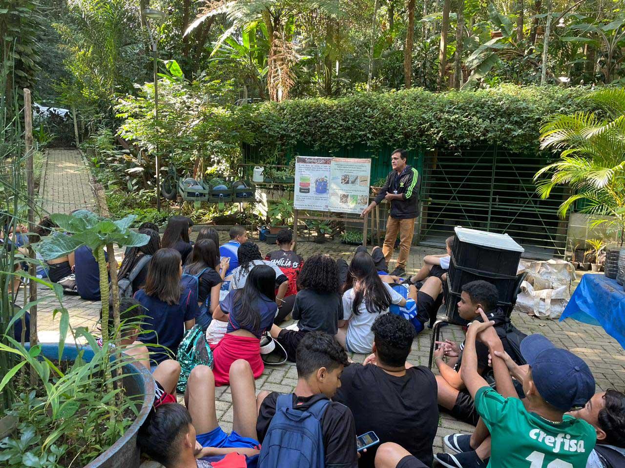 As atividades continuaram na quarta-feira (17), quando 90 estudantes da Escola Estadual Professor Frederico de Barros Brotero aprenderam sobre reprodução e plantio de árvores nativas da Mata Atlântica regional em visita ao Viveiro Educador do CEA, que fica no final da alameda principal do bosque.