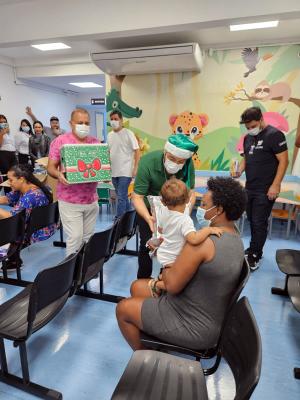 Pais e acompanhantes receberam também das mãos de Guti uma cesta de Natal com alimentos e um kit de higiene pessoal. “Há sete anos fazemos essa ação tanto no dia de Natal como no Dia das Crianças como forma de nos aproximar um pouco mais de quem passa essas datas internado”, afirmou.