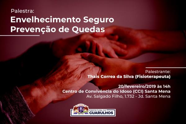 O Centro de Convivência do Idoso (CCI) Santa Mena realiza a palestra gratuita “Envelhecimento seguro – prevenção de quedas”, no próximo dia 20, quarta-feira, às 14 horas, com a fisioterapeuta Thais Correa da Silva. O objetivo é orientar a população com mais de 60 anos de idade sobre o assunto, tendo em vista o crescente aumento da população idosa em Guarulhos e o elevado número de quedas entre este público.