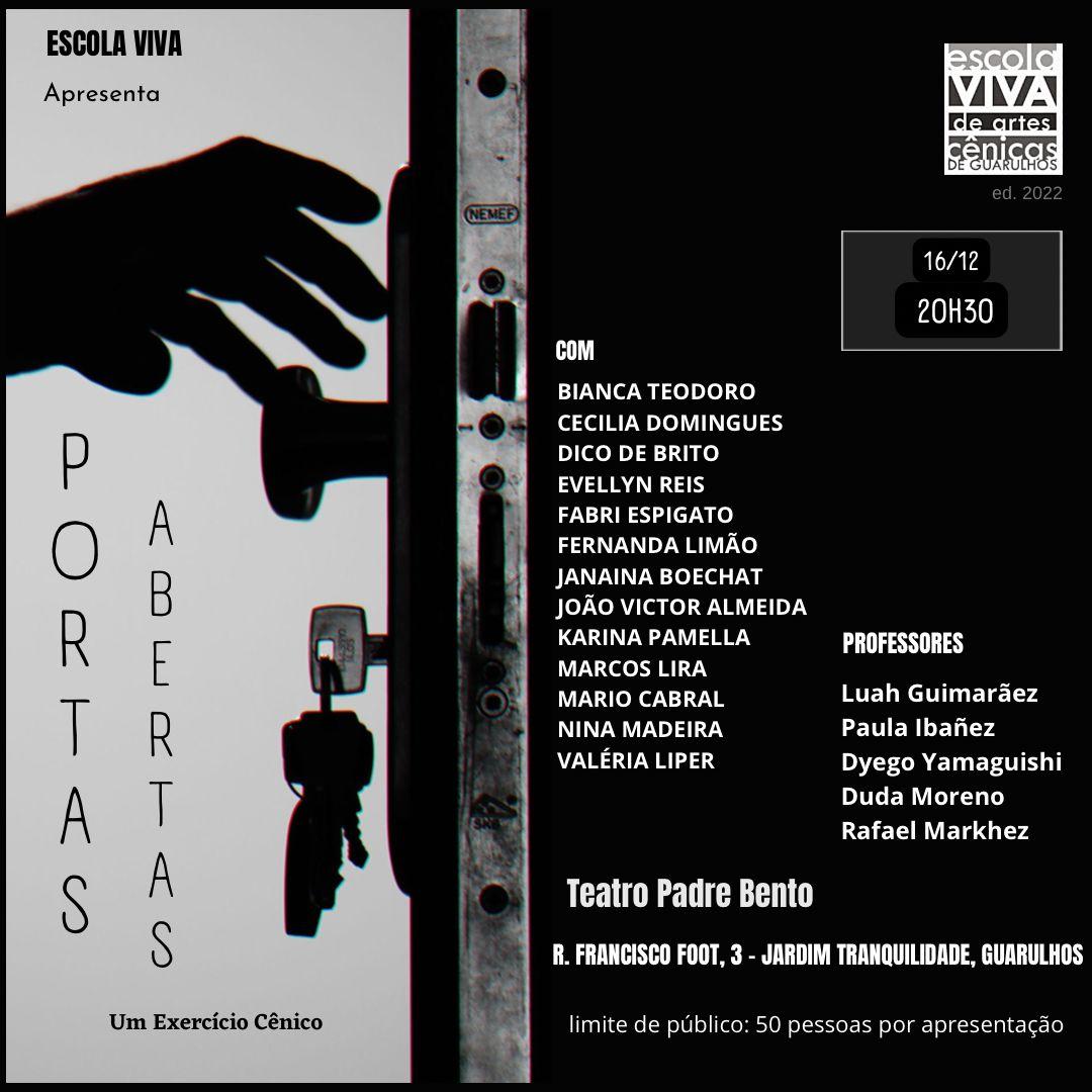 Treze histórias entremeadas por 11 fragmentos de cenas. Na próxima sexta-feira (16), às 20h30, os aprendizes do Núcleo de Pesquisa da Escola Viva de Artes Cênicas encenam o espetáculo Portas Abertas no Teatro Padre Bento, que apresenta resultados de um processo colaborativo em que os participantes foram provocados com perguntas norteadoras como O que te move? O que te dói? O que você não pode mais calar?