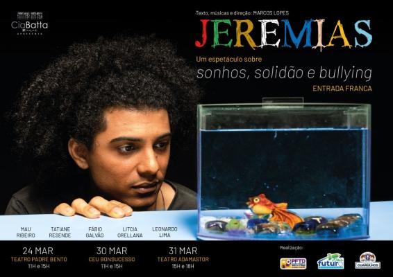 Bullying, preconceito racial e sexualidade são os temas abordados pelo espetáculo Jeremias, que terá seis apresentações gratuitas em Guarulhos no mês de março desenvolvidas pela companhia Ciabatta de Teatro. A primeira apresentação acontece no Teatro Padre Bento, no próximo dia 24 com duas sessões, às 11h e às 15h. A data seguinte é 30 de março no CEU Bonsucesso, às 11h e às 15h, e para finalizar as apresentações do mês o espetáculo chega ao Teatro Adamastor no dia 31, às 15h e às 18h.