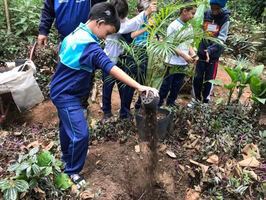 Para encerrar as atividades do dia os alunos colocaram a mão na terra e plantaram uma muda de palmeira nativa da Mata Atlântica. A iniciativa é parte do projeto O Impacto da nossa Escola no Meio Ambiente, da Secretaria de Educação.